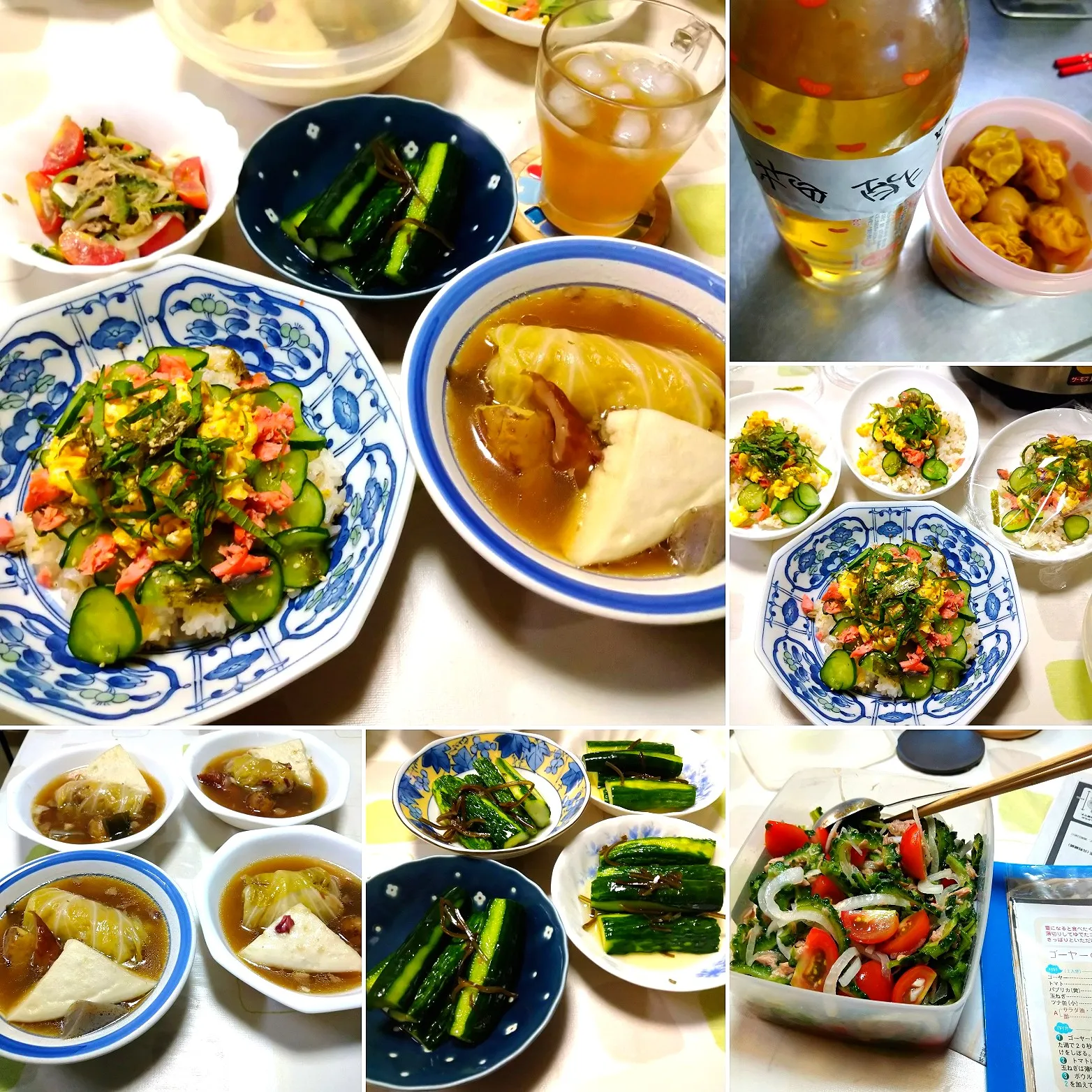鮭フレーク無くて、冷凍していた鮭を焼いて解して、きゅうり、炒り卵で飾って