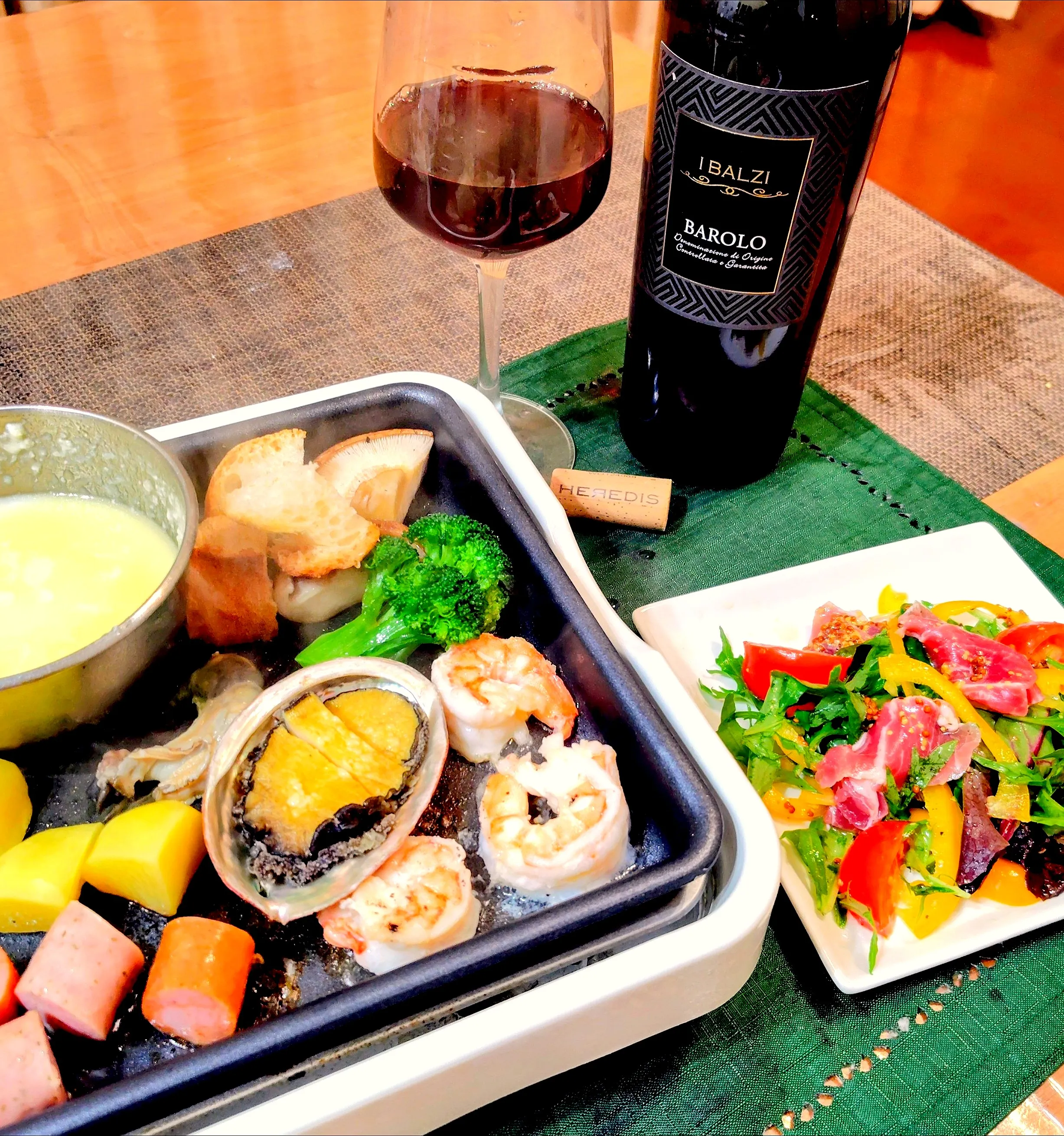 チーズフォンデュ(海老、鮑、ウインナー、ブロッコリー、ジャガイモ、バケット、椎茸)