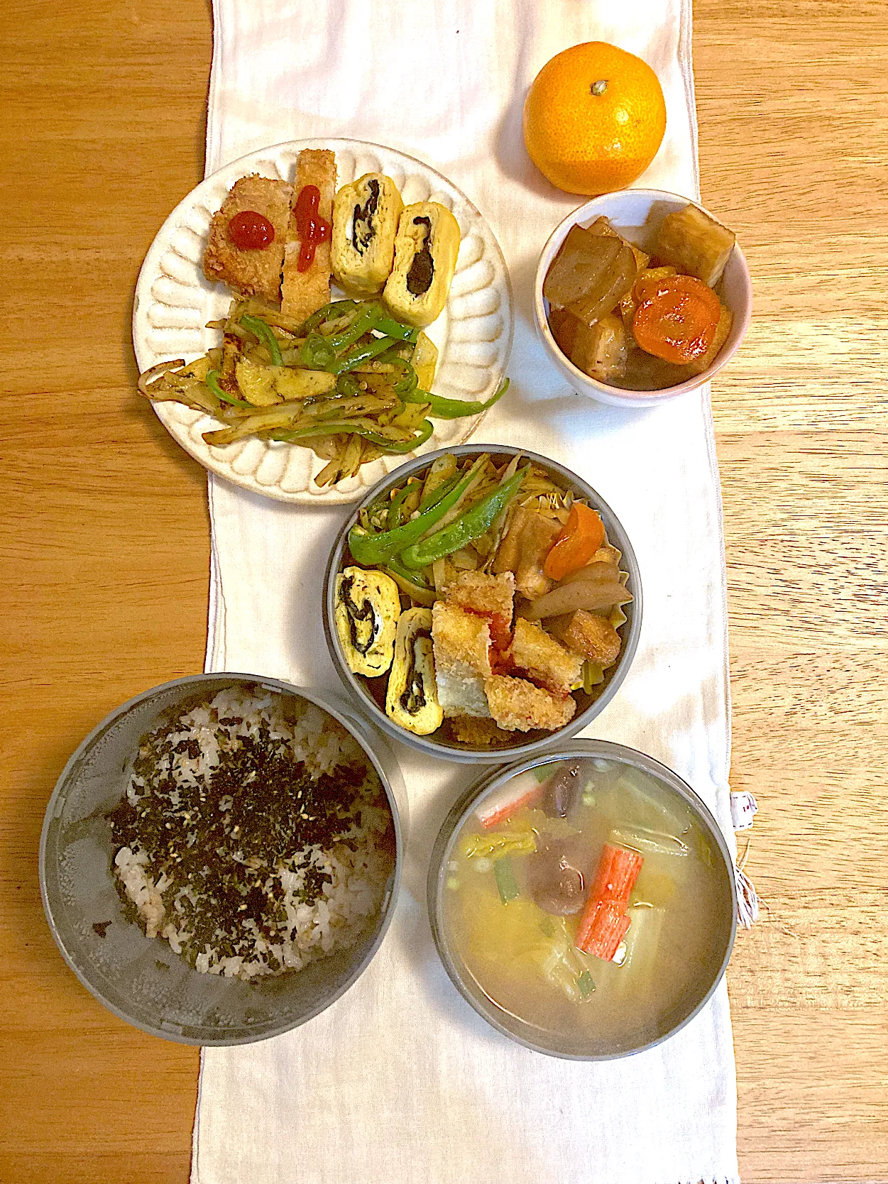 ローストンカツ、海苔入り卵焼き、ジャガイモとピーマンの青のりソース炒め、厚揚げと蒟蒻と人参の煮物、紫もち麦とホワイトチアシード入り夢つくしご飯、