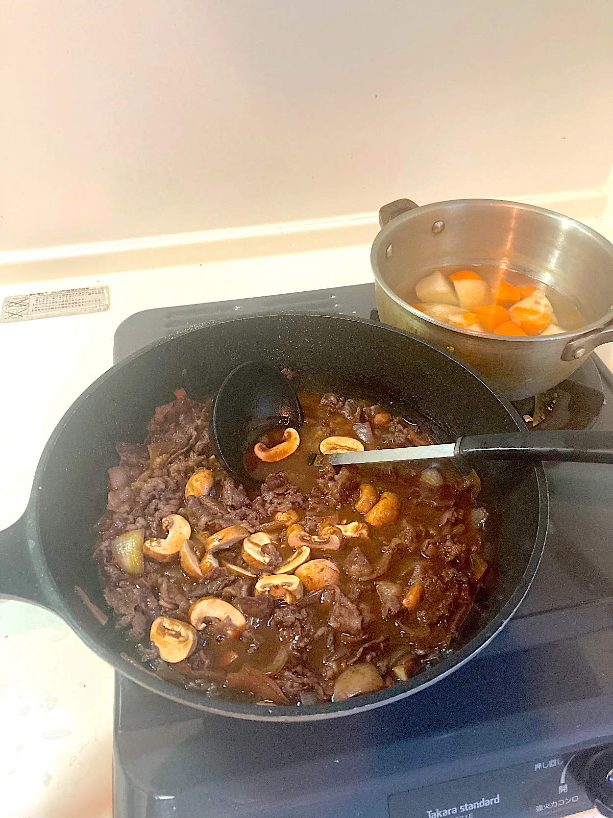 今日の晩ご飯⑥ クリーニング屋さんから帰ってきました。クリーニングに出していた夏のスーツをピックアップしてきました。急に寒くなったので衣替えです。さて、調理再開。バターを投入し、マッシュルームを入れて一煮立ちさせたら完成