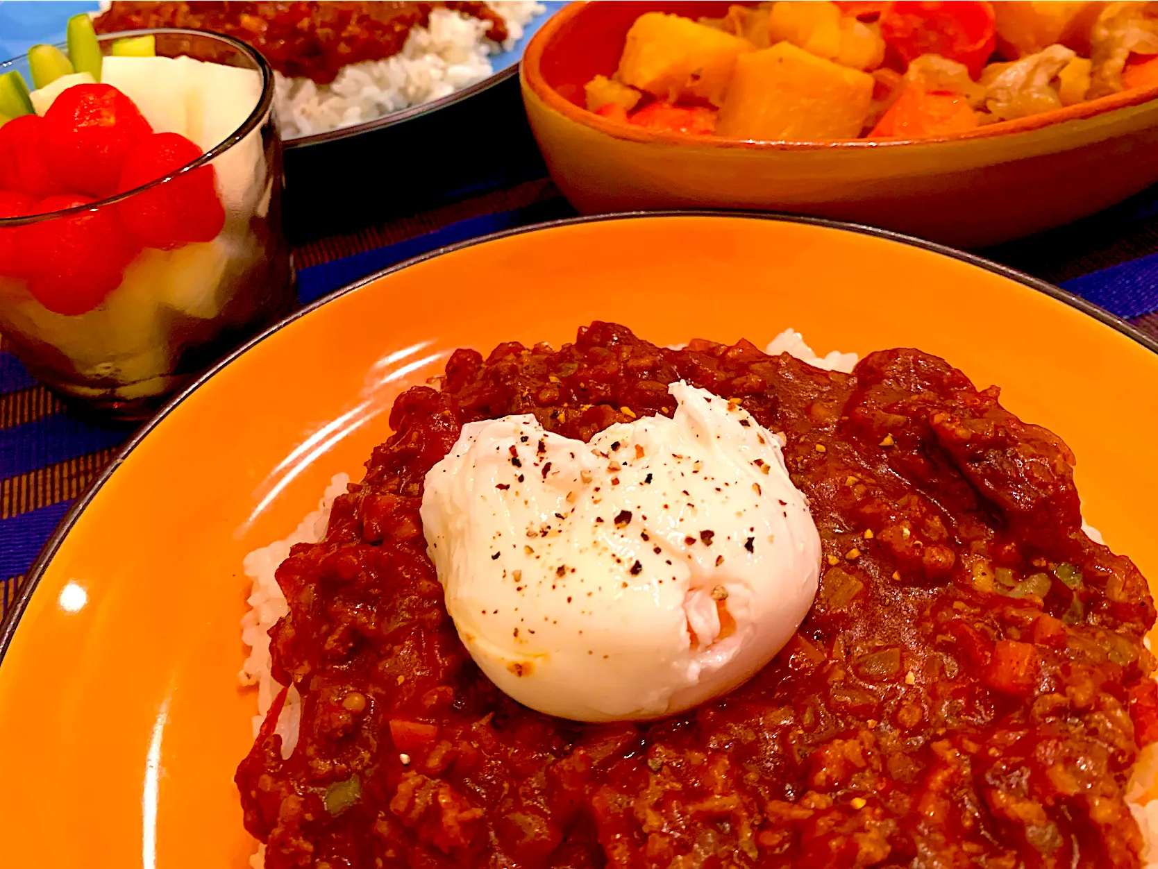 #キーマカレー #トマト #カットトマト #挽肉 #玉ねぎ #にんじん #ピーマン #肉じゃが #ピクルス #ポーチドエッグ #記録用 #簡単料理