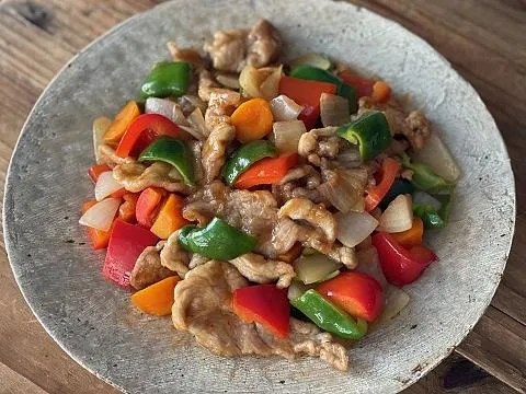薄切りの豚肉をカリッと揚げ焼きして、彩り豊かな野菜と炒め合わせたピリッと辛い酢豚です。辛旨韓国料理が楽しめる「ヤマサ 万能クッキングたれ Yummy! コリアンホット」に酢を加えて中華にアレンジしたひと品です。