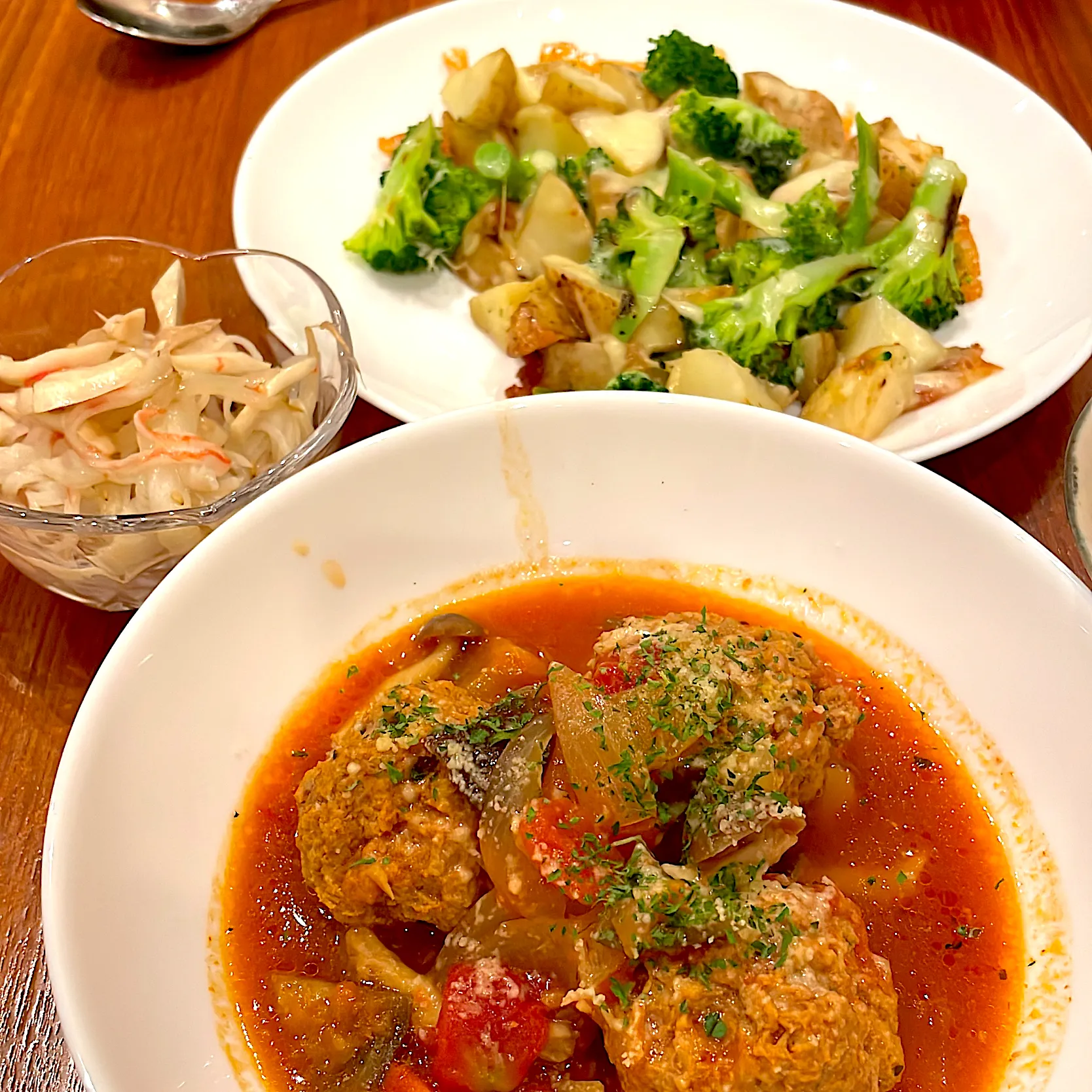 煮込みミートボール もやしナムル ブロッコリーポテトのチーズ焼き