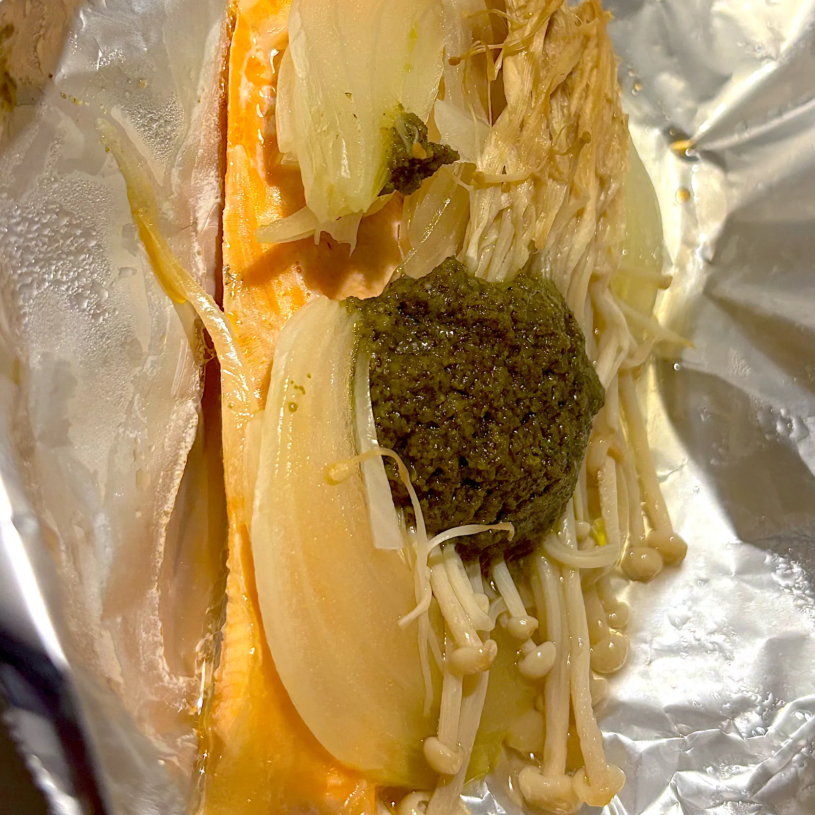 鮭、玉ねぎ、えのきと、紫蘇で作ったジェノベーゼソースで蒸し焼きに。