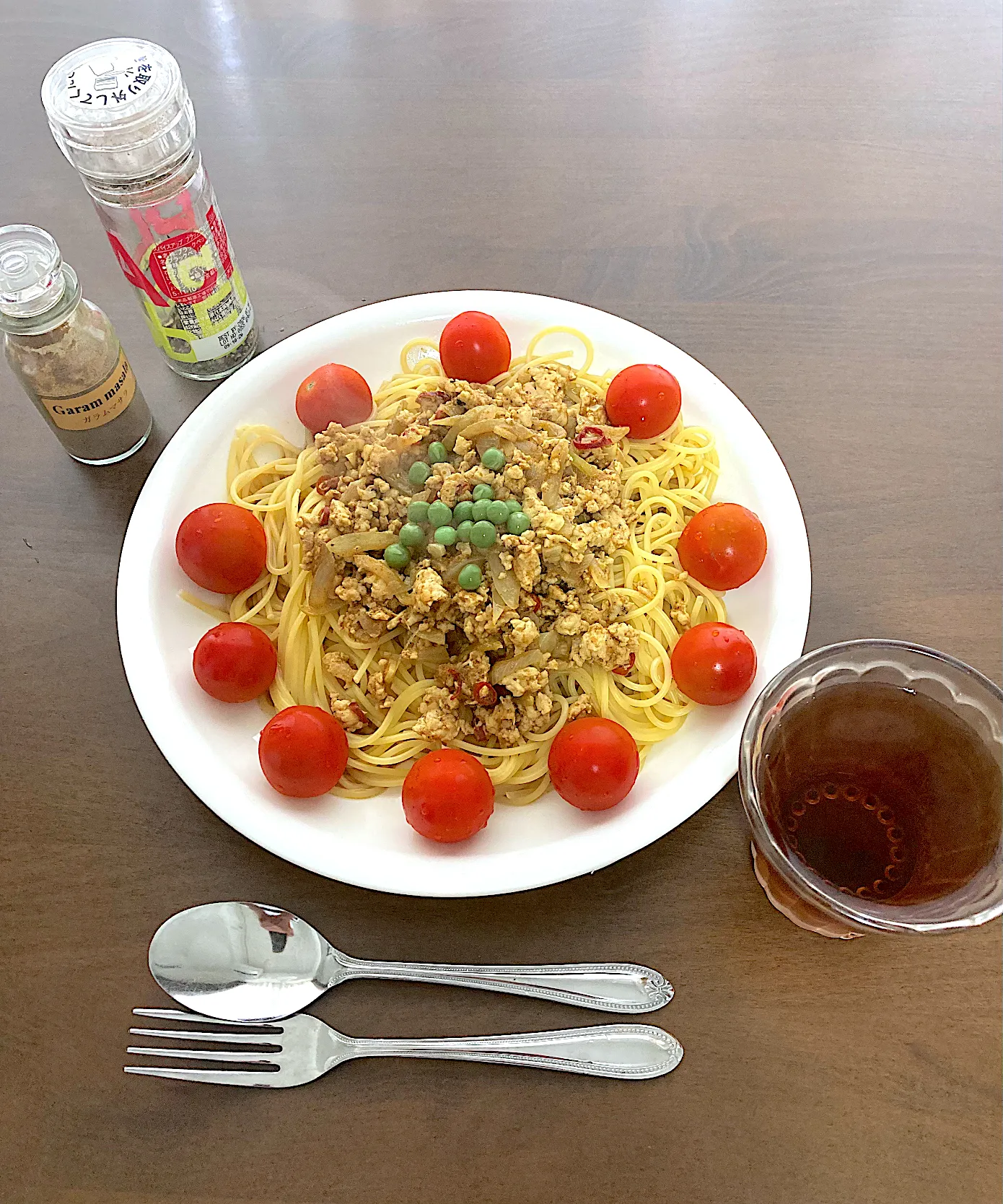 熱々のスパゲッティの上にキーマカレーをかけ、グリーンピースとミニトマトを飾ったら完成。卓上のペッパーとガラムマサラで味を整えます。ちなみに家内(はやと)と娘(あーちゃん)は今、ホノルルから羽田に向かう機上です。機内食美味しいのかなあ?