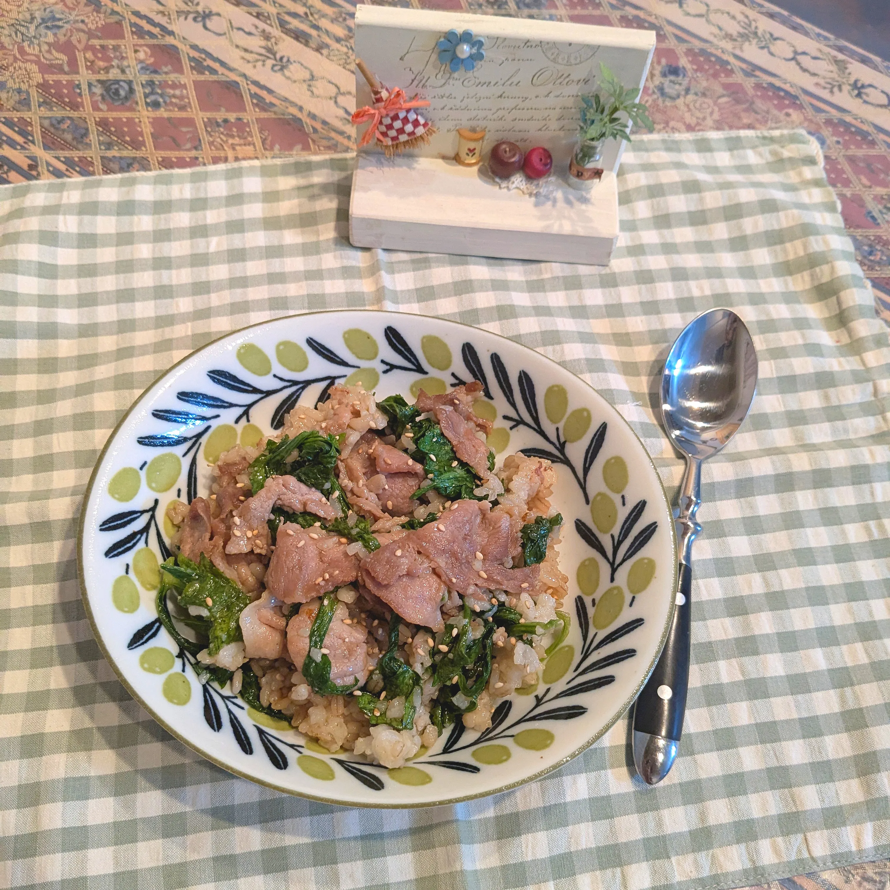 豚肉を甘辛く味付けしてご飯と炒め、セロリの葉を入れて胡麻を振って仕上げました。セロリの葉がアクセントになり美味しく仕上がりました💚