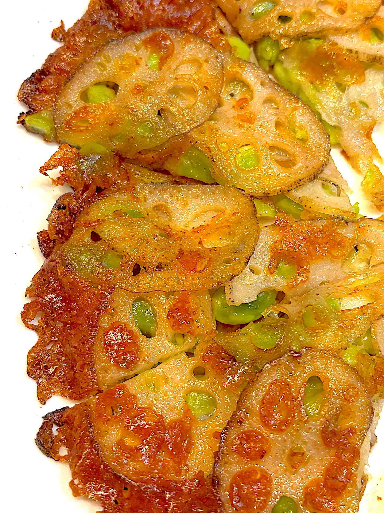 蓮根のスライス、枝豆、チーズ、蓮根を重ねてガレットに。弱火でカリカリになるまで焼きます。