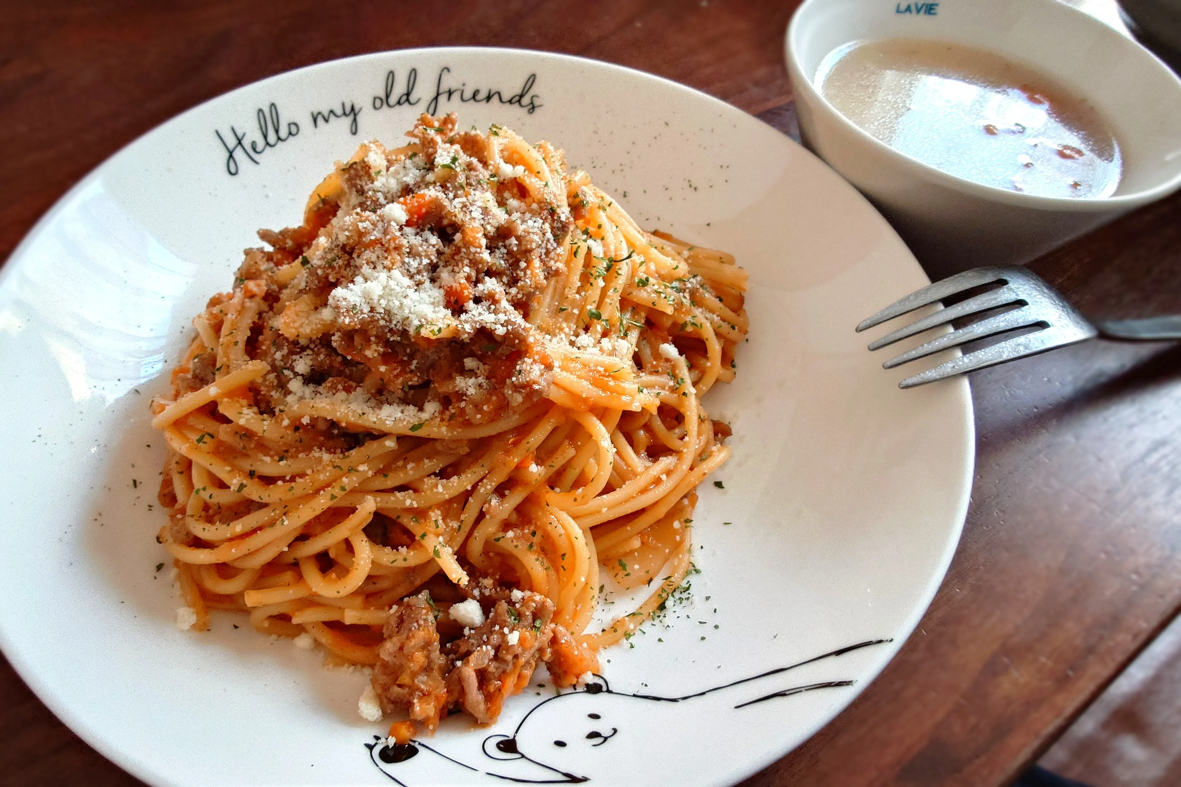 いつもナポリタンしか作ることを許されないランチパスタ……反抗してミートソースにしたけどなんとか子供達に認めていただきました…