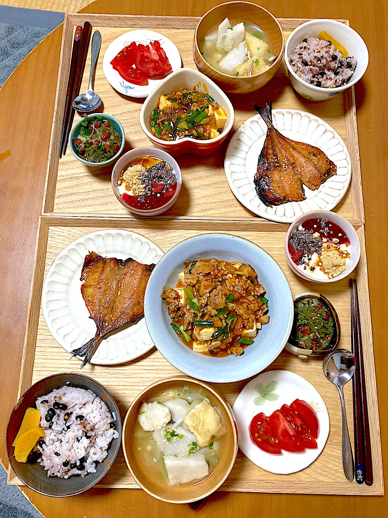 麻婆豆腐*味味醂干し*里芋と油揚げのお味噌汁*赤豆納豆メカブ亜麻仁オイル*きび砂糖かけトマト*古代黒豆ご飯*糠漬けたくあん*トッピング盛りだくさん豆乳グルト