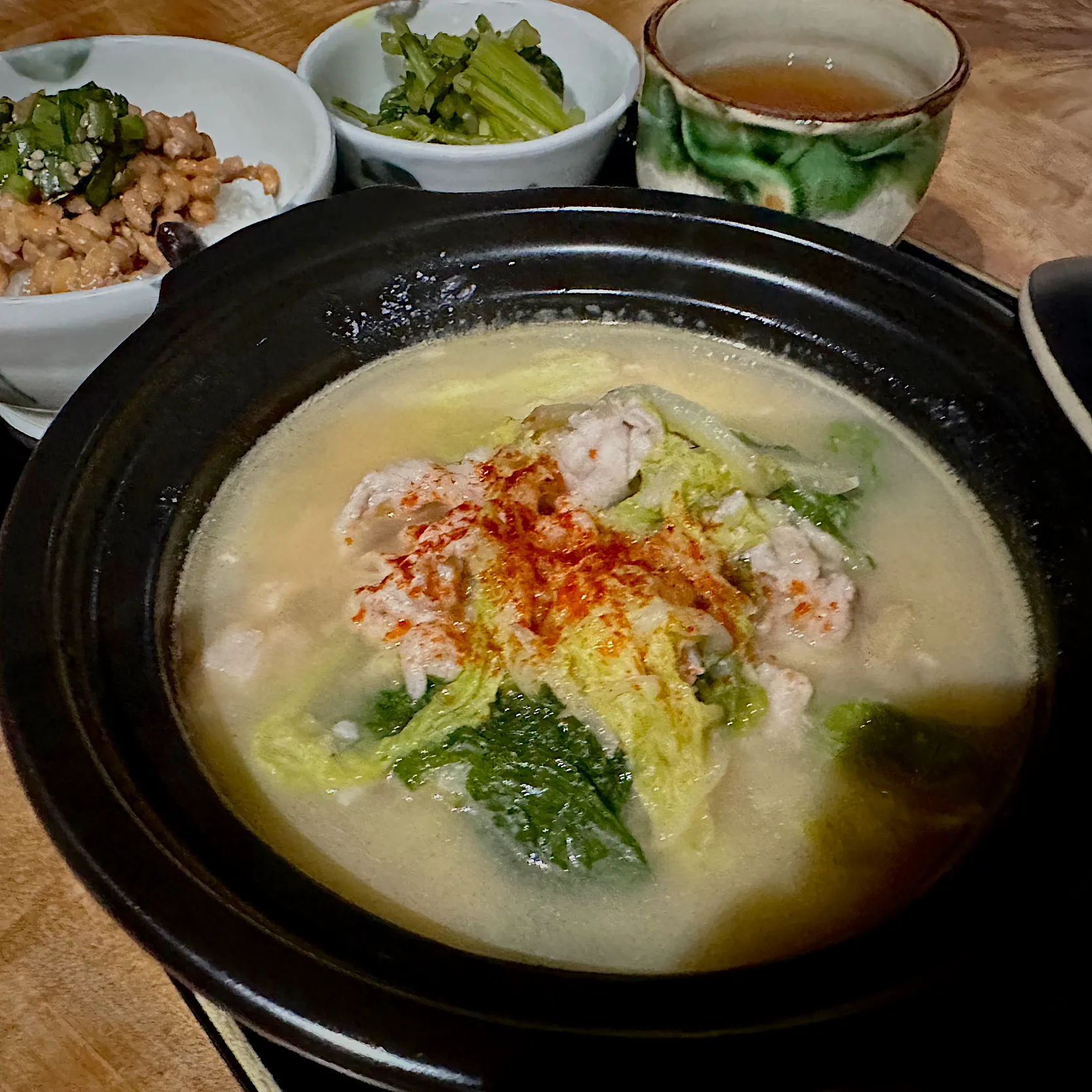 塩麹、ニンニク、出汁、ナンプラーで味付け。パプリカパウダーかけたりして、ミルフィーユ鍋っぽくないけど(すでに崩しちゃったし)