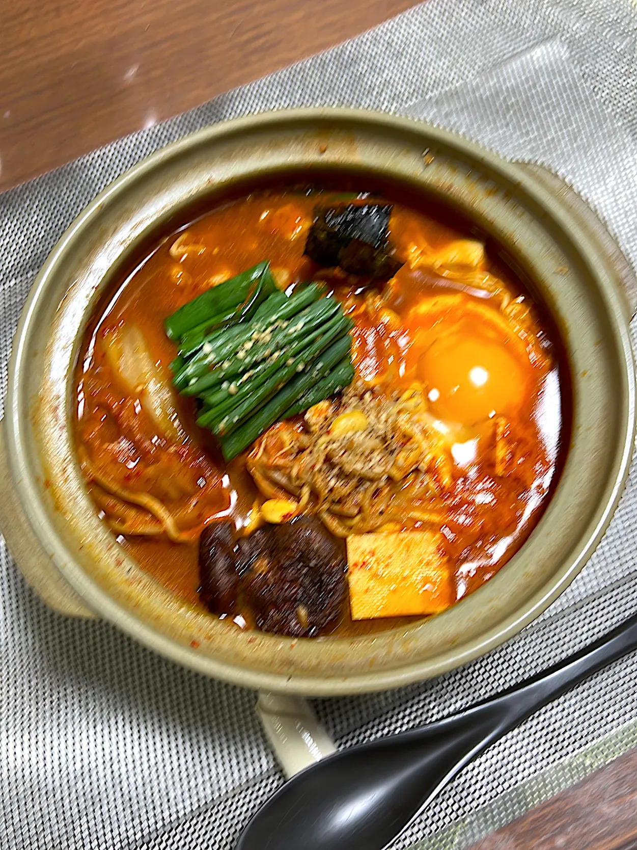 粗挽き肉ステーキ、温野菜のチーズ蒸し、チゲスープ