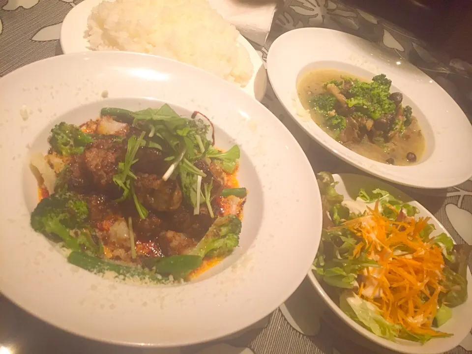 ランチの残り駆使してまかないサイコロステーキ風バルサミコソース*きのことブロッコリーの鶏出汁スープ(^^)
