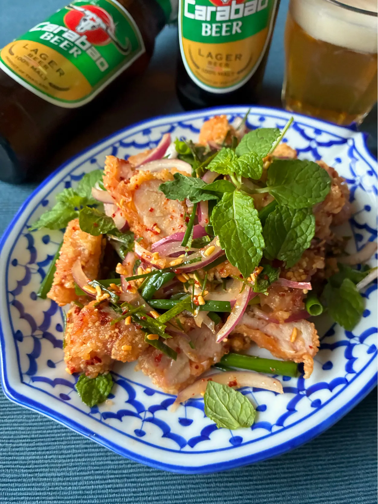 ナンプラーで下味をつけたタイ風唐揚げを作って、和える味付けはラープっぽそうだったのでネギ類やミント、パクチーと一緒にラープ味で和えました。