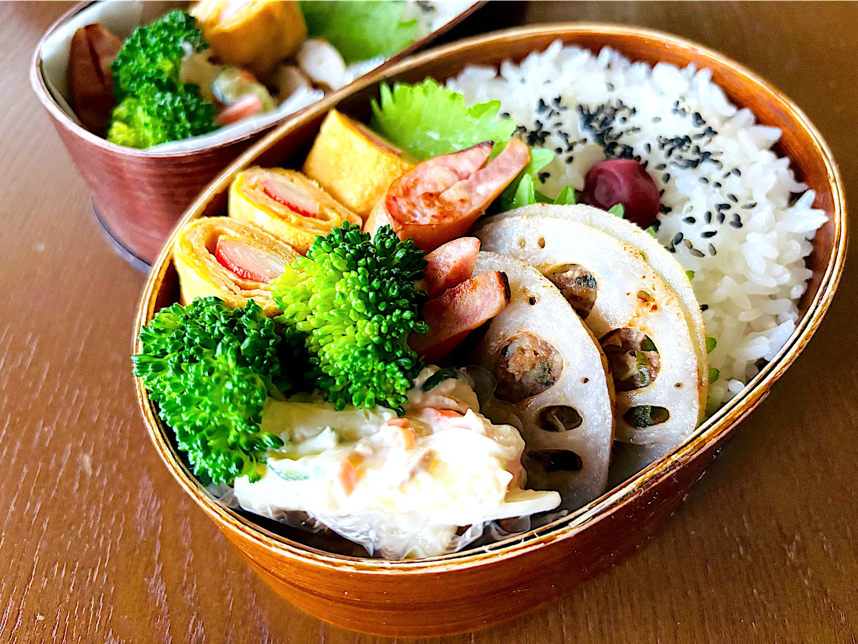 #カニカマ入り玉子焼き #レンコン餃子 #つくおき #自家製梅干し #雪若丸 #お弁当 #曲げわっぱ弁当箱 #わっぱ弁当 #曲げわっぱ