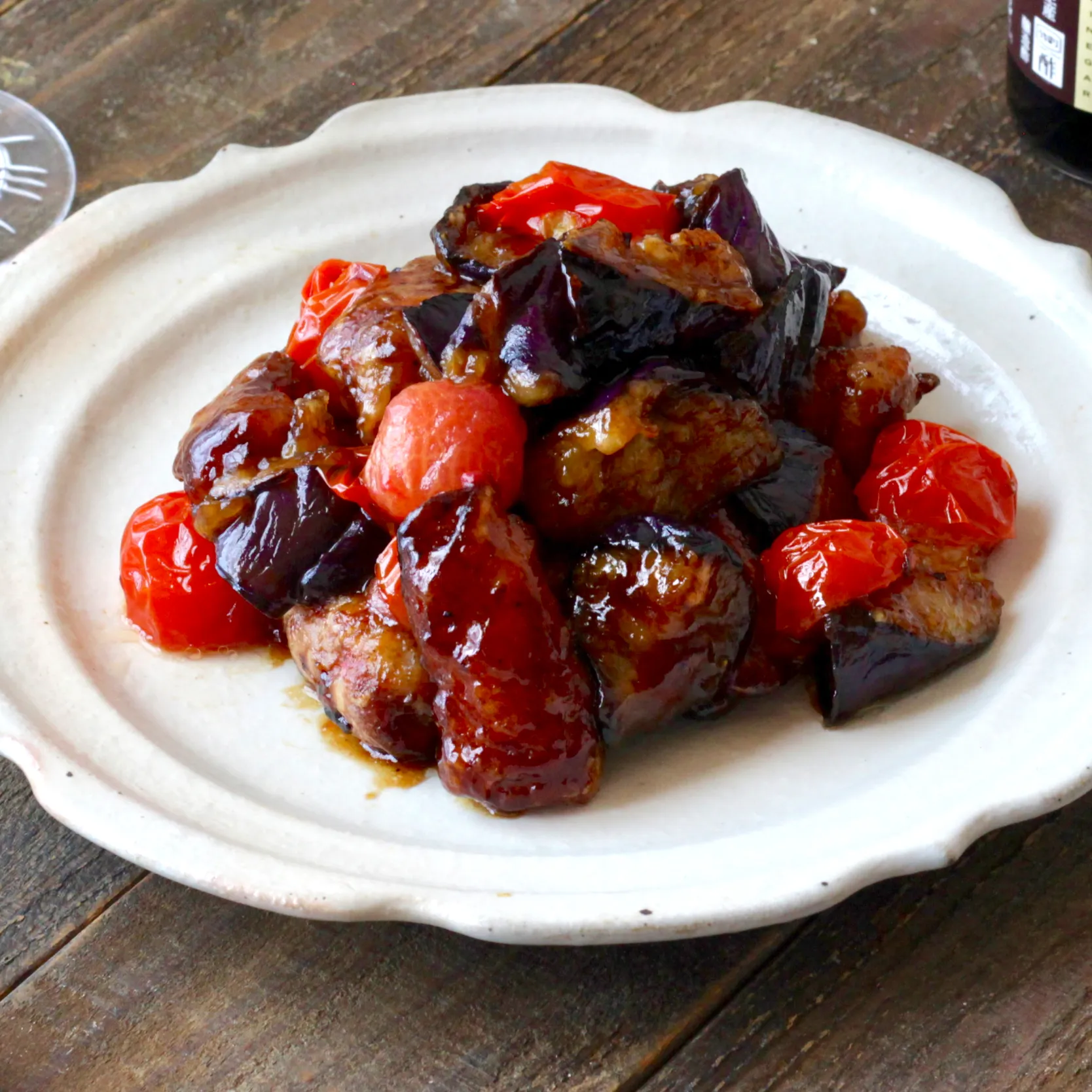 バルサミコ酢の酸味とコクでちょっと大人の味わいにジューシーなトマトの酸味となすのとろっと食感が豚肉の旨みを引き立てます。
