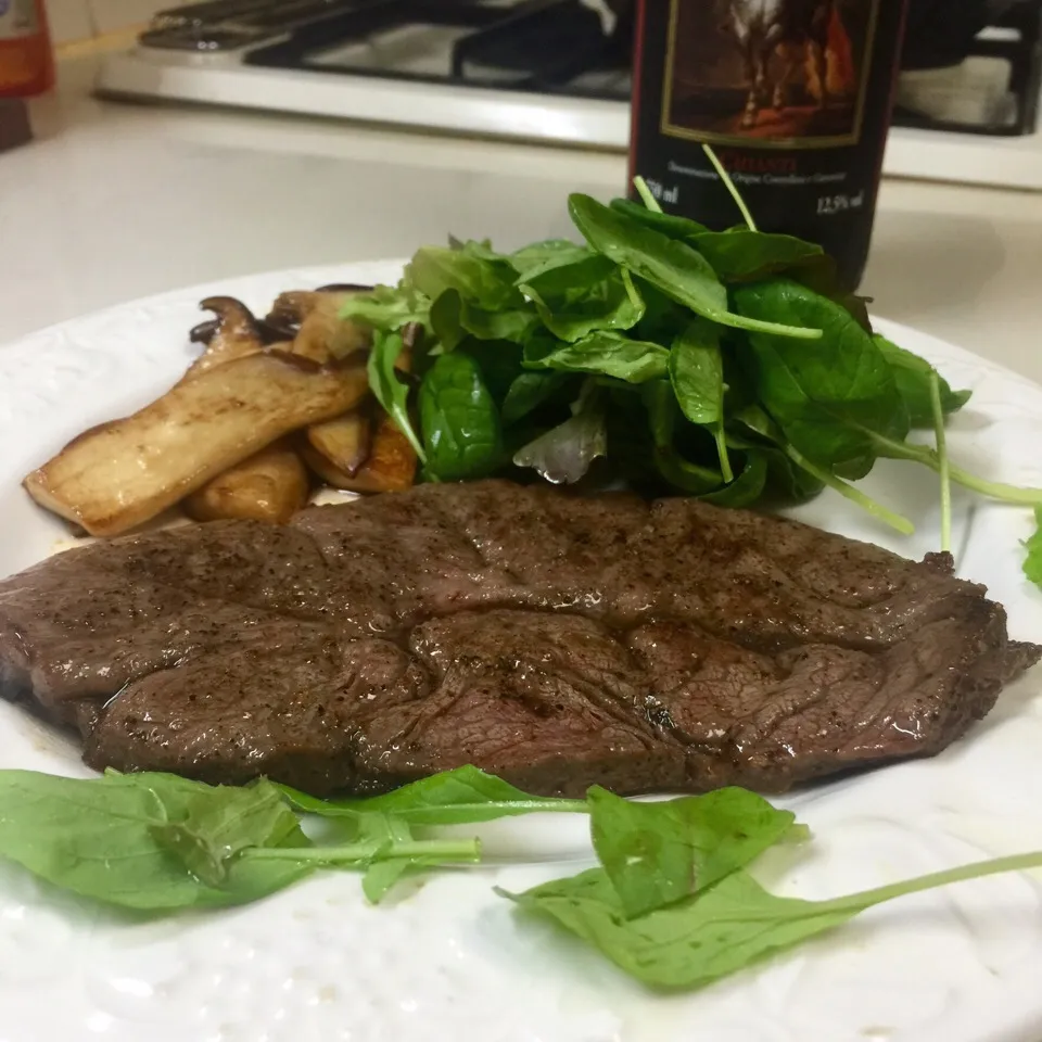 和牛ミスジ肉のステーキ。ワインはキャンティ。