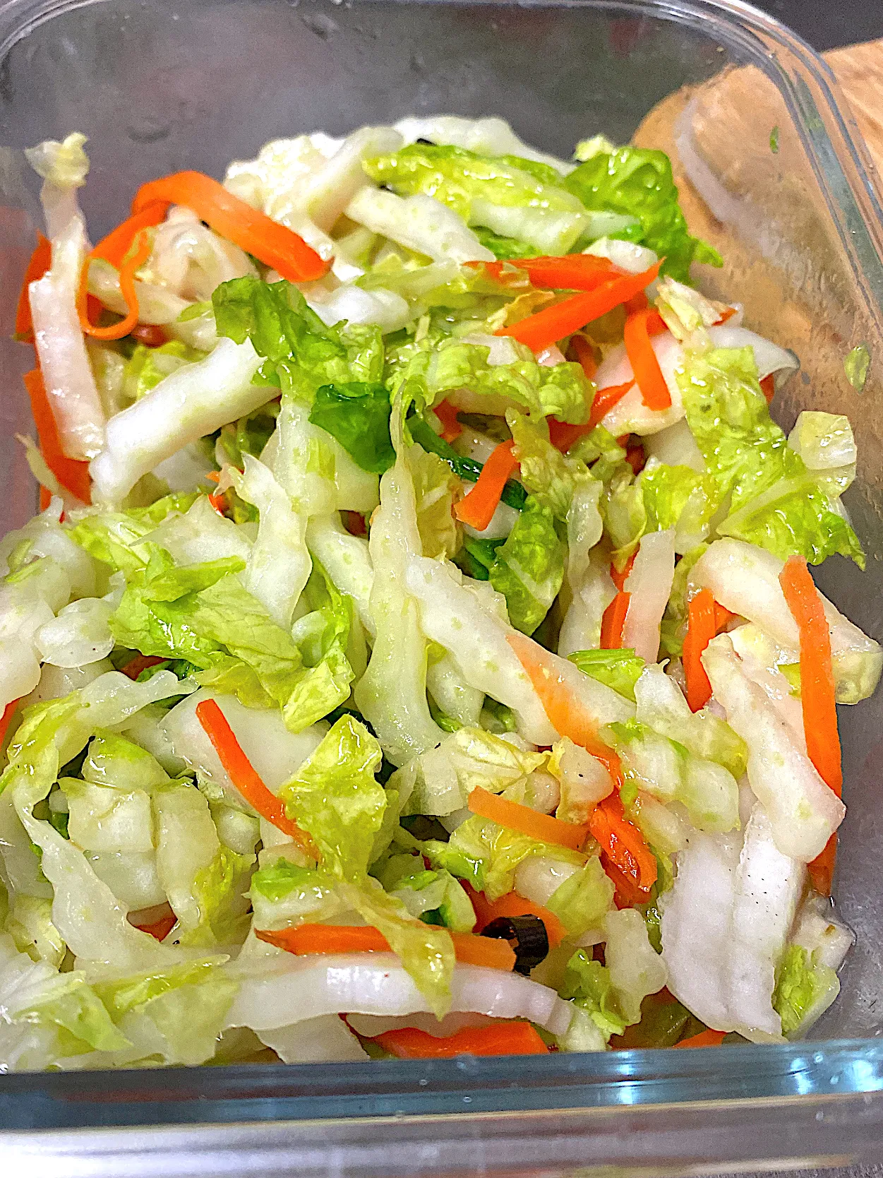 小さなフライパンにごま油大さじ2赤唐辛子一本を小口切りにしたものを弱火で熱し、和える。