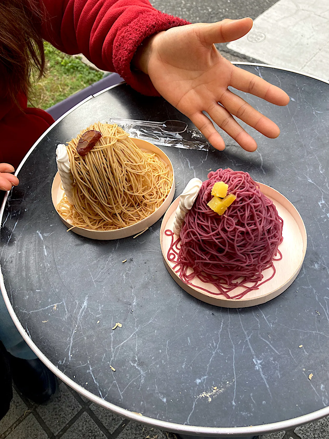 「栗りん」さんのモンブランソフト黄金(栗)(はやと)とモンブランソフト濃紫(芋)(ぼく)をいただきまーす😋(実況中継終了)