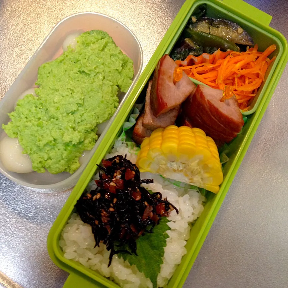 ハムステーキ、茄子とピーマンの味噌炒め、人参しりしり、トウモロコシ、白米(梅ひじき&大葉)、ずんだ白玉