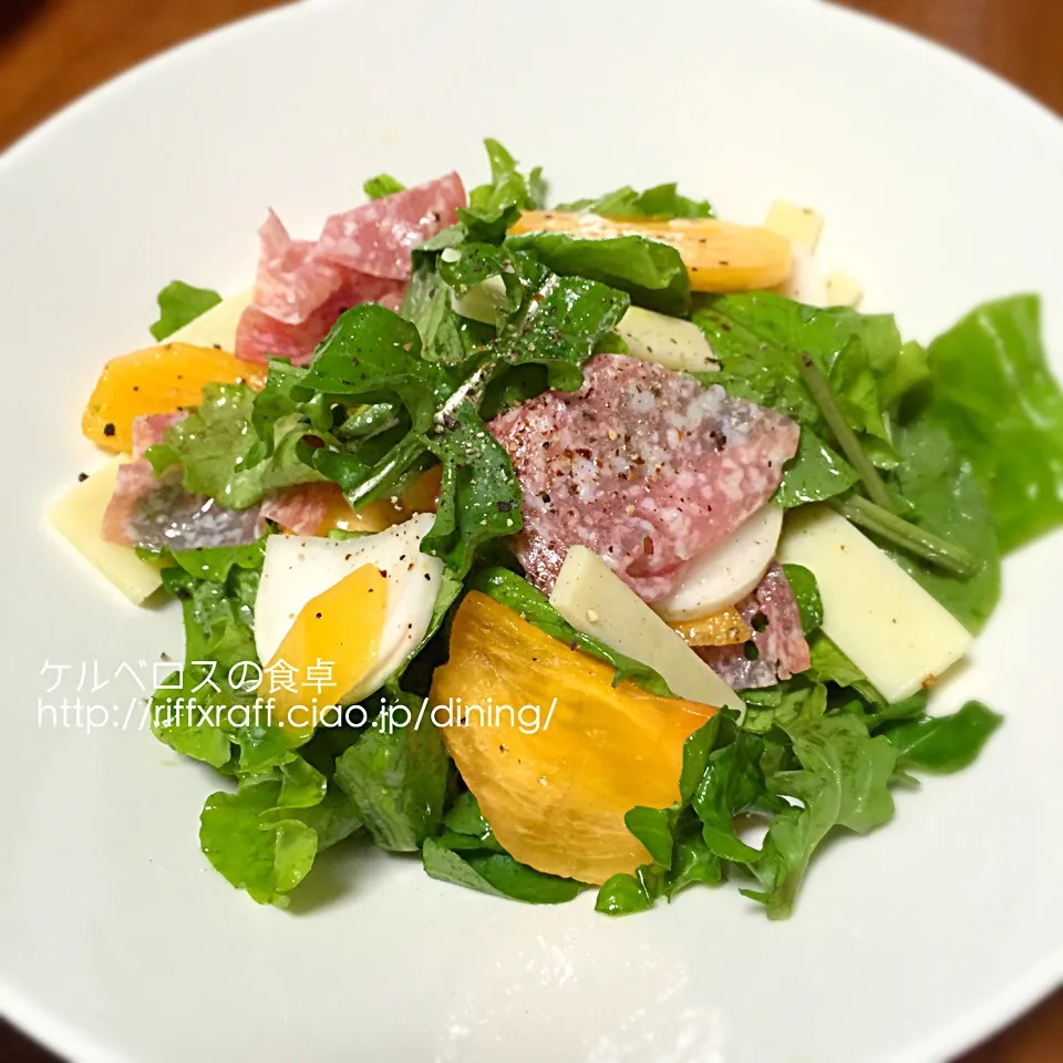 ルッコラとチーズとソフトサラミは食べやすい大きさに、カブ柿はスライスしておく。