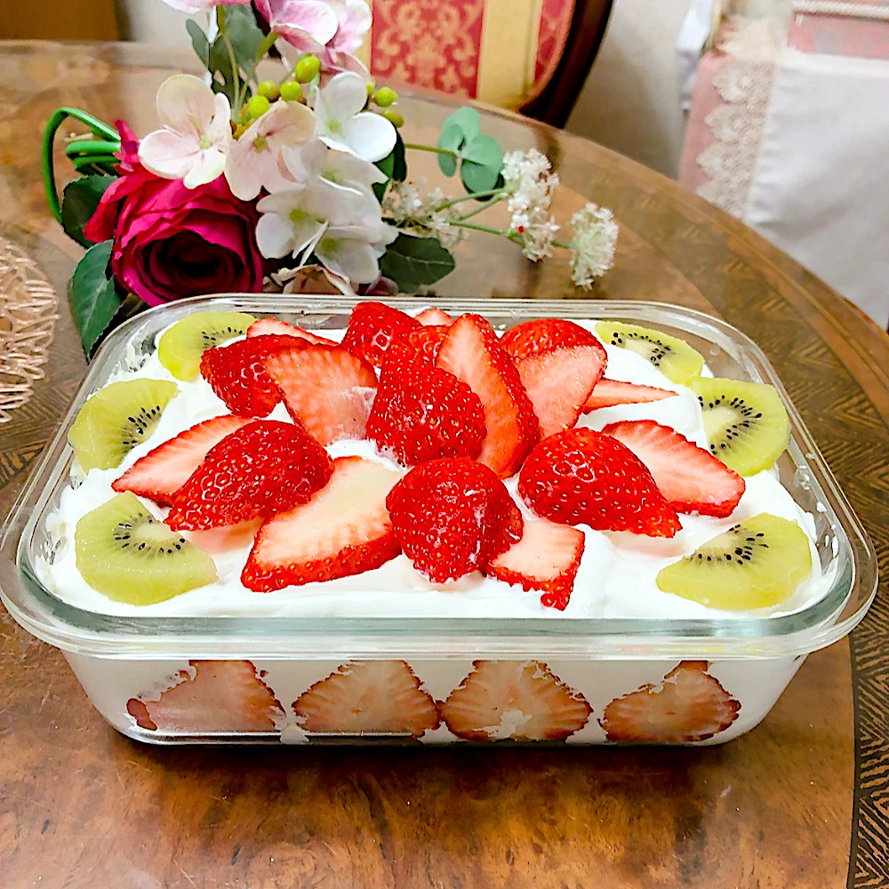スコップケーキ 今回は、いちご🍓とキィウイと缶詰の黄桃、キルシュで作りました🌸