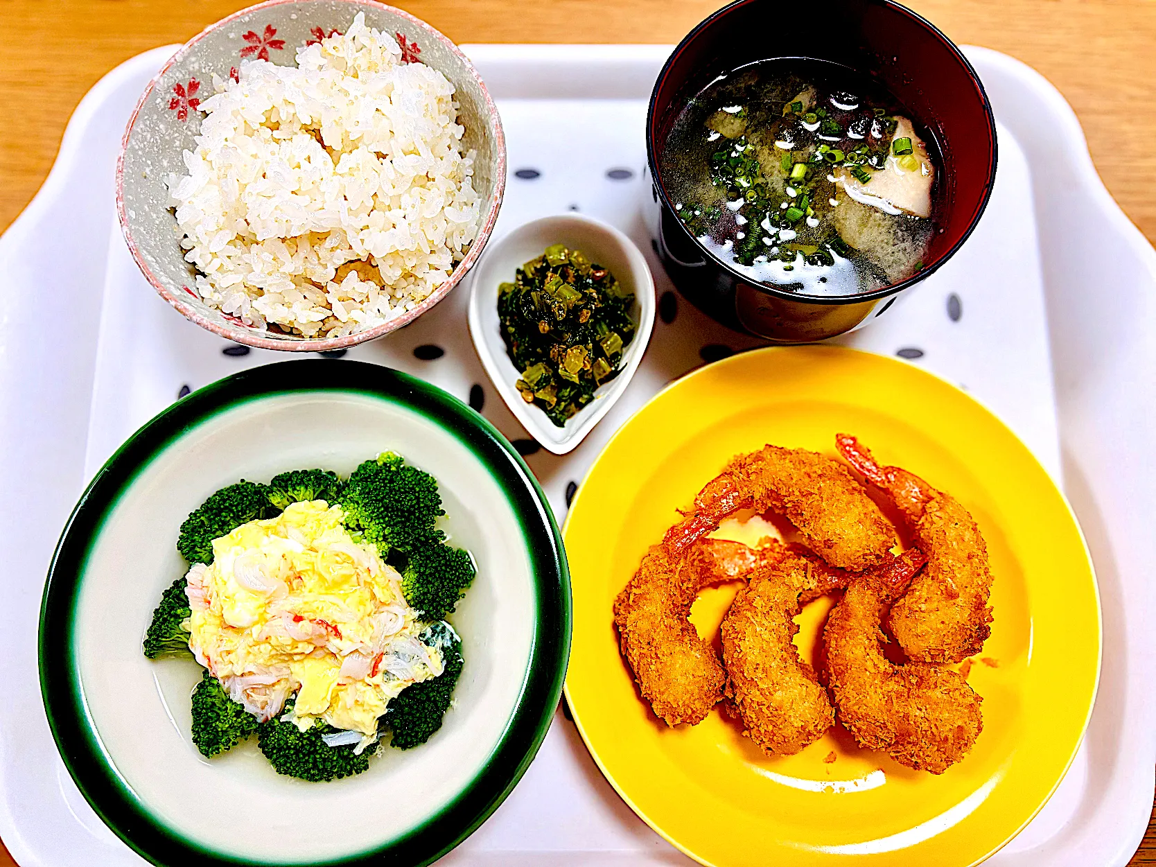うちの晩ごはん エビフライ、ブロッコリーのカニ玉あんかけ、大根と椎茸のお味噌汁、大根葉のふりかけ