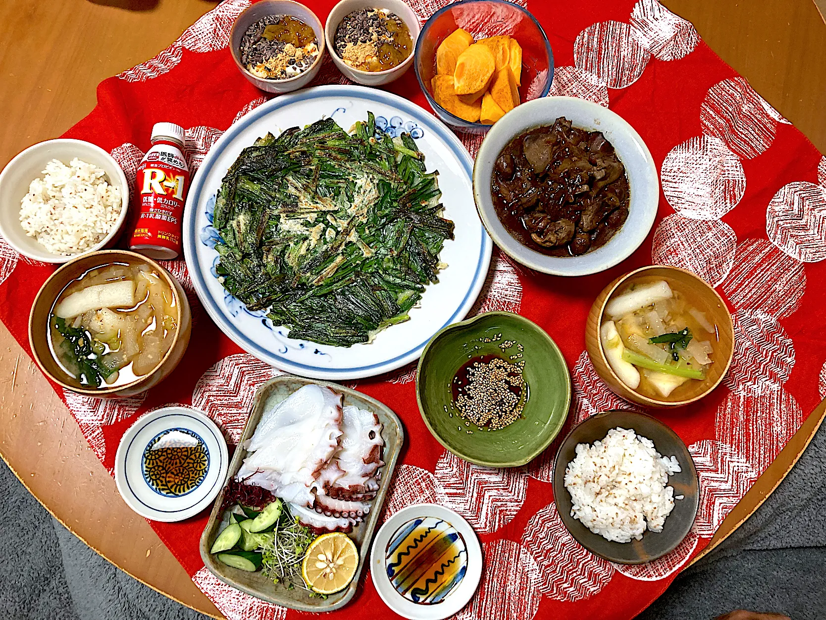 ニラチヂミ♡鶏レバー甘辛煮♡タコのお刺身♡大根とハンペンのお味噌汁♡いつもの色々トッピング豆乳グルト♡柿♡ヨーグルトドリンク