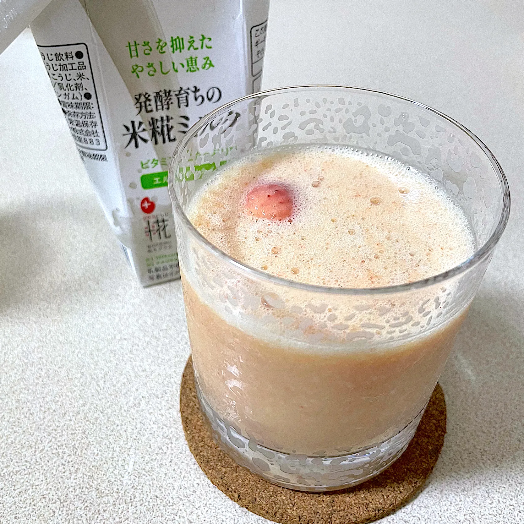 いつものバナナとイチゴとオレンジジュースのスムージーに、マルコメさんの米糀ミルクを足してみました。