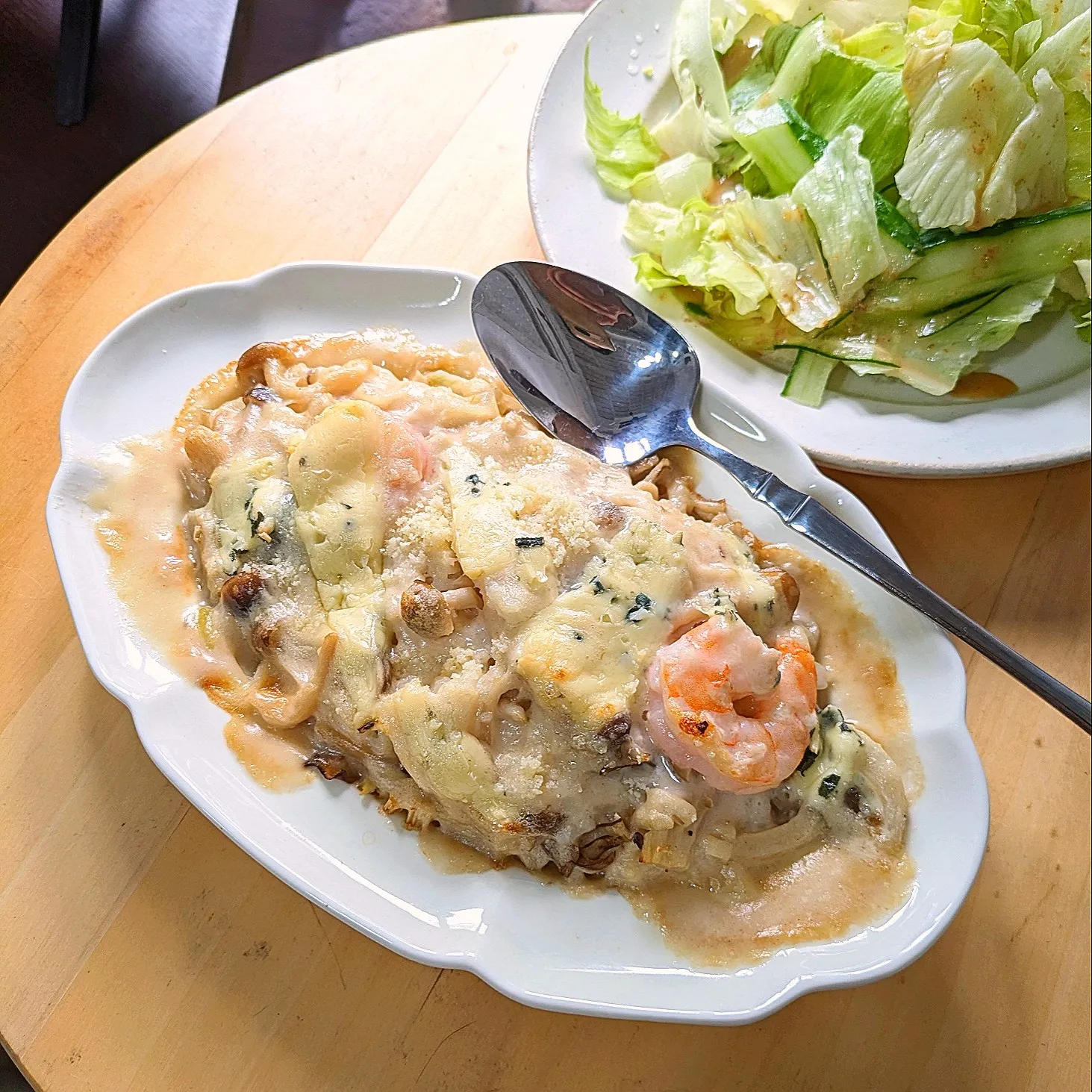 #エビ #イカ #ブルーチーズ #しめじ #玉葱 #ドリア #ごはん #無塩バター #残り物 #ホワイトソース #もりもり #サラダ