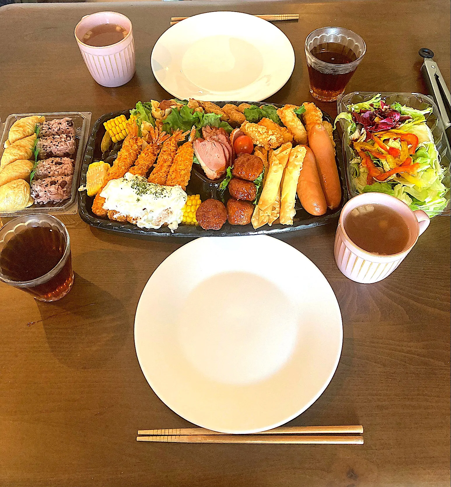 大晦日の昼ご飯 イオン金山店でオードブルセットと稲荷寿司&赤飯握りとイタリアンサラダを買い、ちょっと豪勢な忘年会です
