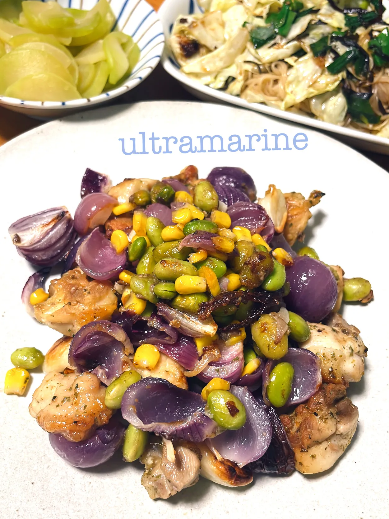 #オリーブオイル #にんにく #ガーリック #紫玉ねぎ #小玉ねぎ #枝豆 #コーン #宗田節 #ニラ #キャベツ #半田麺 #瓜 #うり #お漬物