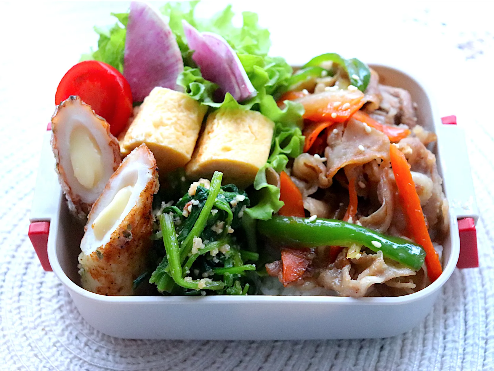 野菜サラダ、野菜たっぷり生姜焼き、玉子焼き、ほうれん草ピーナッツ和え、ちくチー磯辺焼き