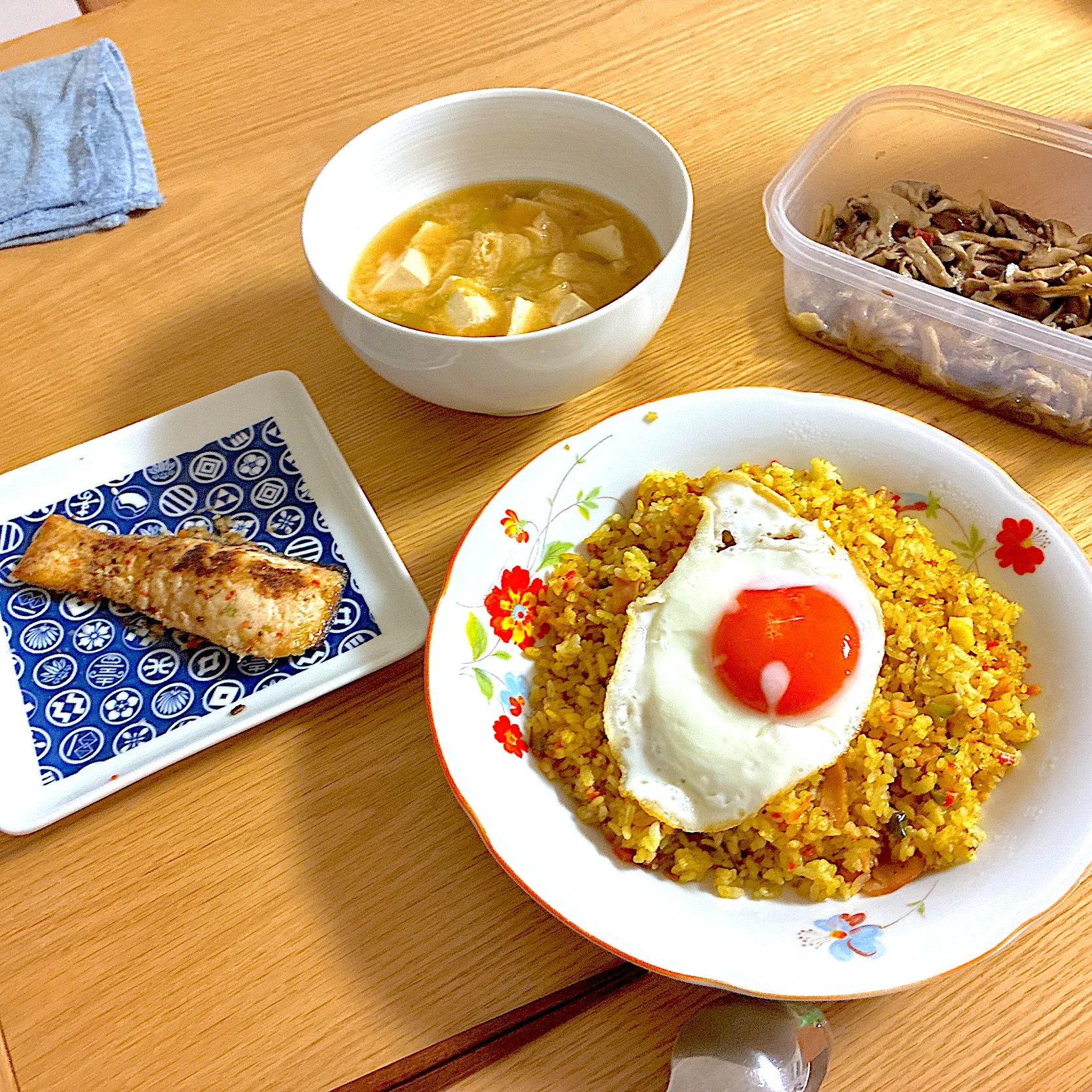 カレーピラフは、塩、白胡椒、そばつゆ、ウスターソース、チキンコンソメで、調味しました。
