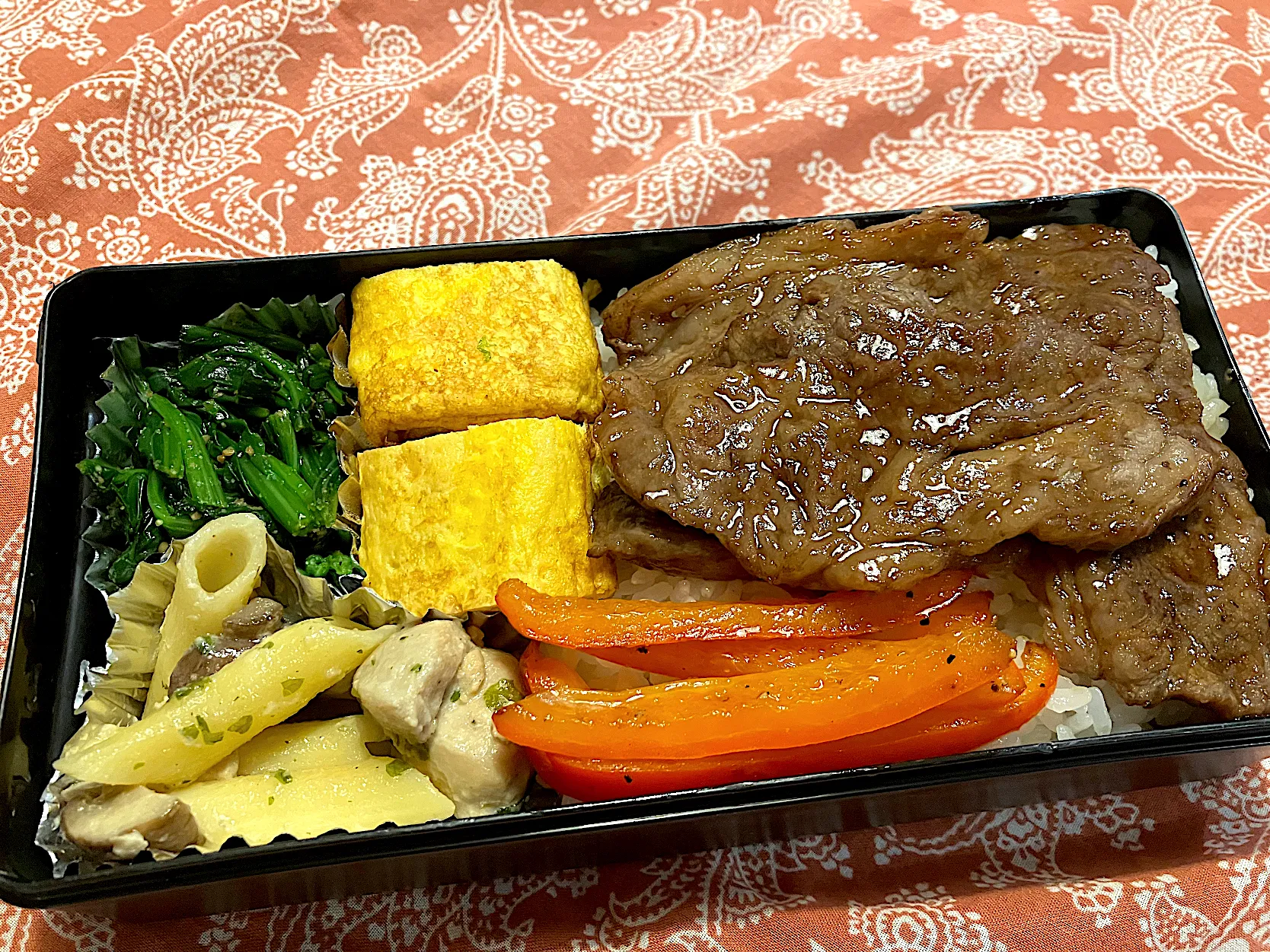 2025.11.27 息子弁当 ◎焼肉丼 ◎卵焼き ◎焼きパプリカ ◎ほうれん草胡麻和え ◎マッシュルームとチキンのクリームパスタ