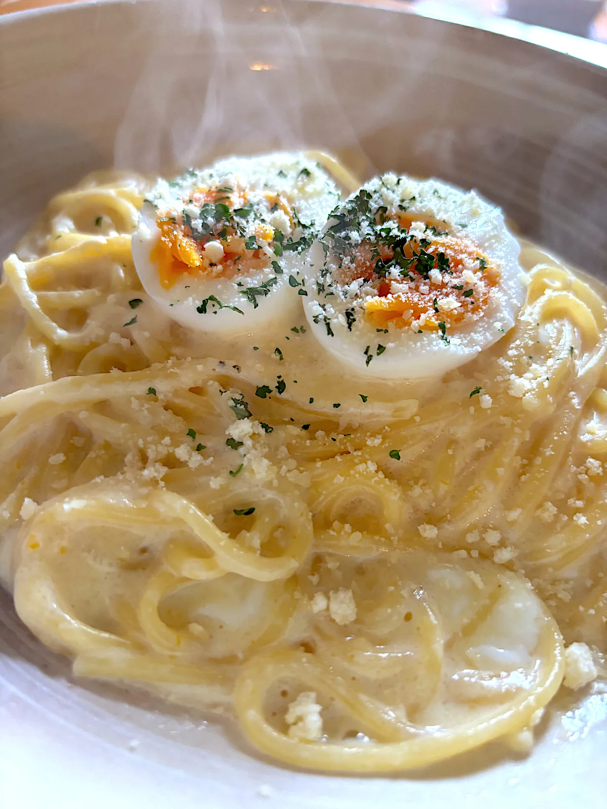 カルボナーラ ゆで卵乗せ🥚‪𐤔𐤔‬