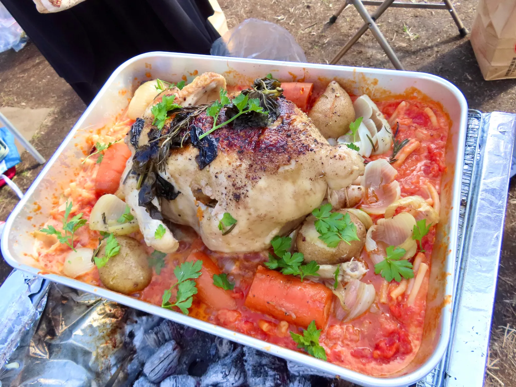 ジャガイモ、にんじん、玉ねぎと一緒に丸鶏をダッジオーブンでで焼いて、トマトクリームソースで。