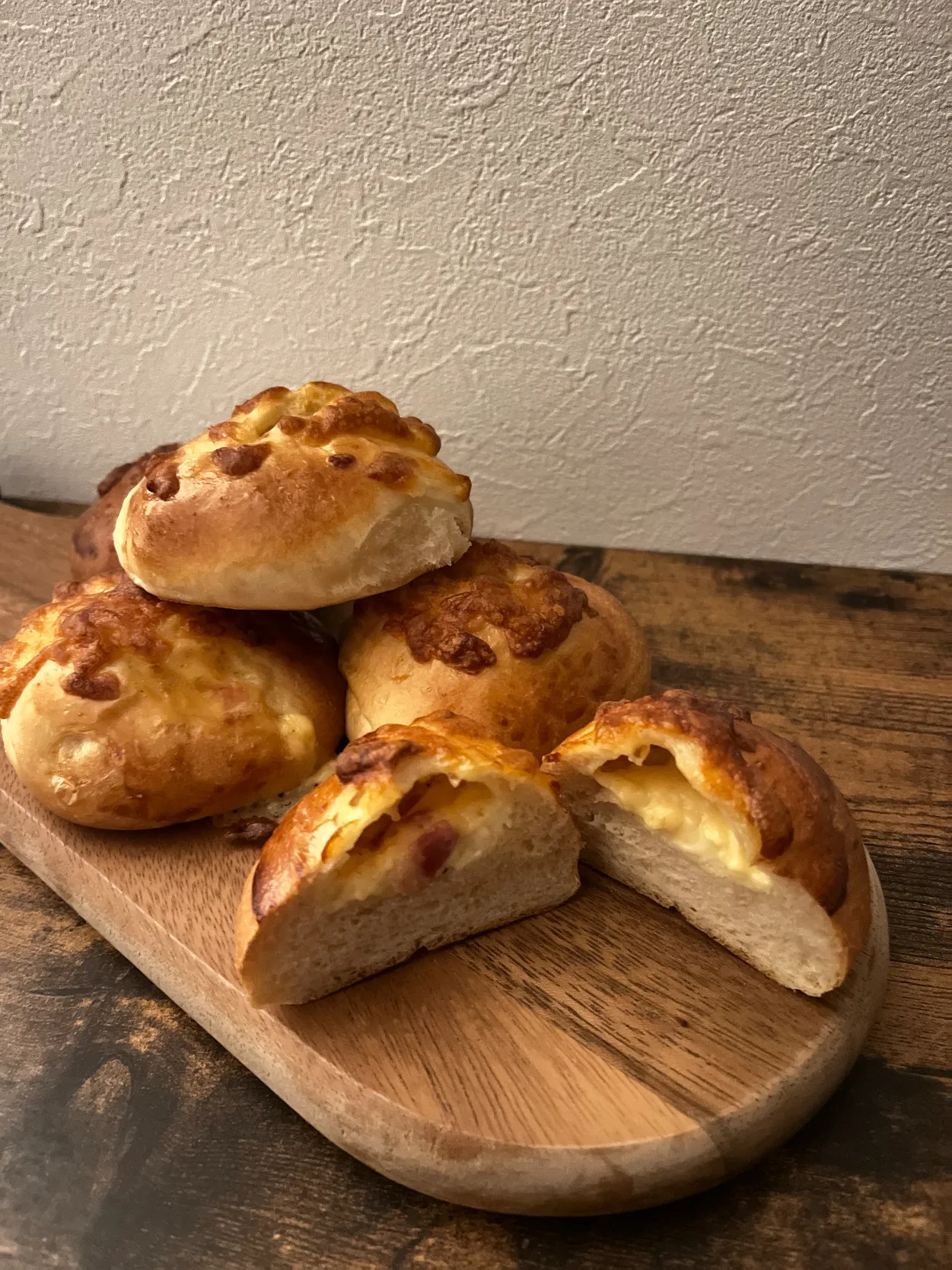 丁寧に作ったホワイトソースに、チーズ2種としいたけ茶、ベーコン等を入れて冷やし、パン生地に包んで焼いたら、パン屋さんに売ってるような味のグラタンパンができて満足。