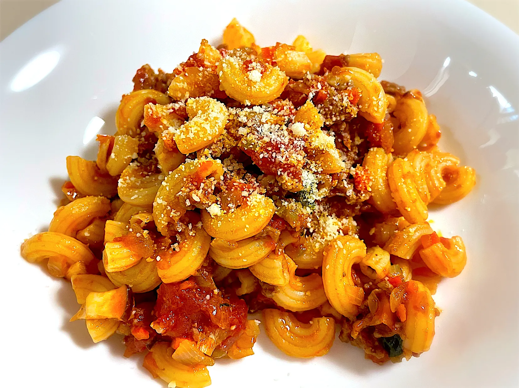 ひき肉、玉ねぎ、にんじん、ピーマン、トマト缶、ケチャップ、ウスターソース、コンソメ、ニンニク、塩胡椒、粉チーズ、バジルが入ってます。