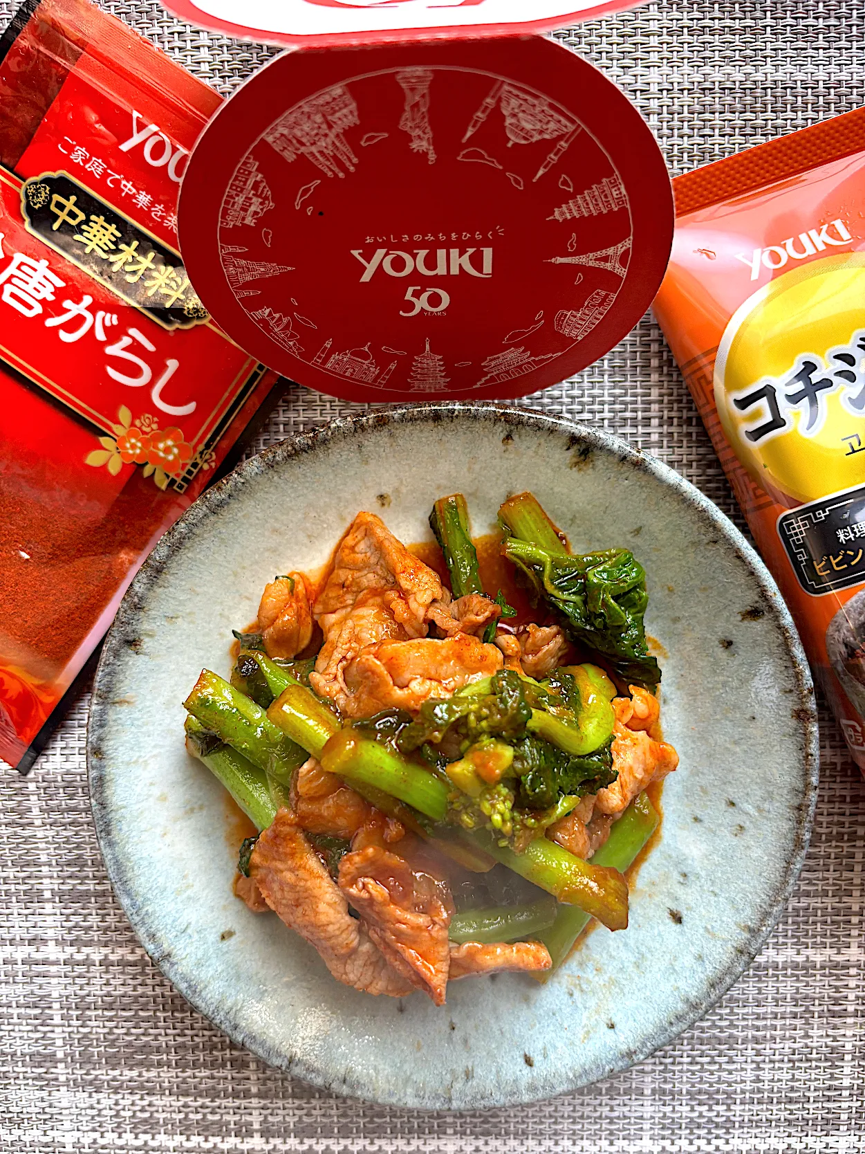 コチジャンベースの菜の花の一人前ピリ辛おつまみ。