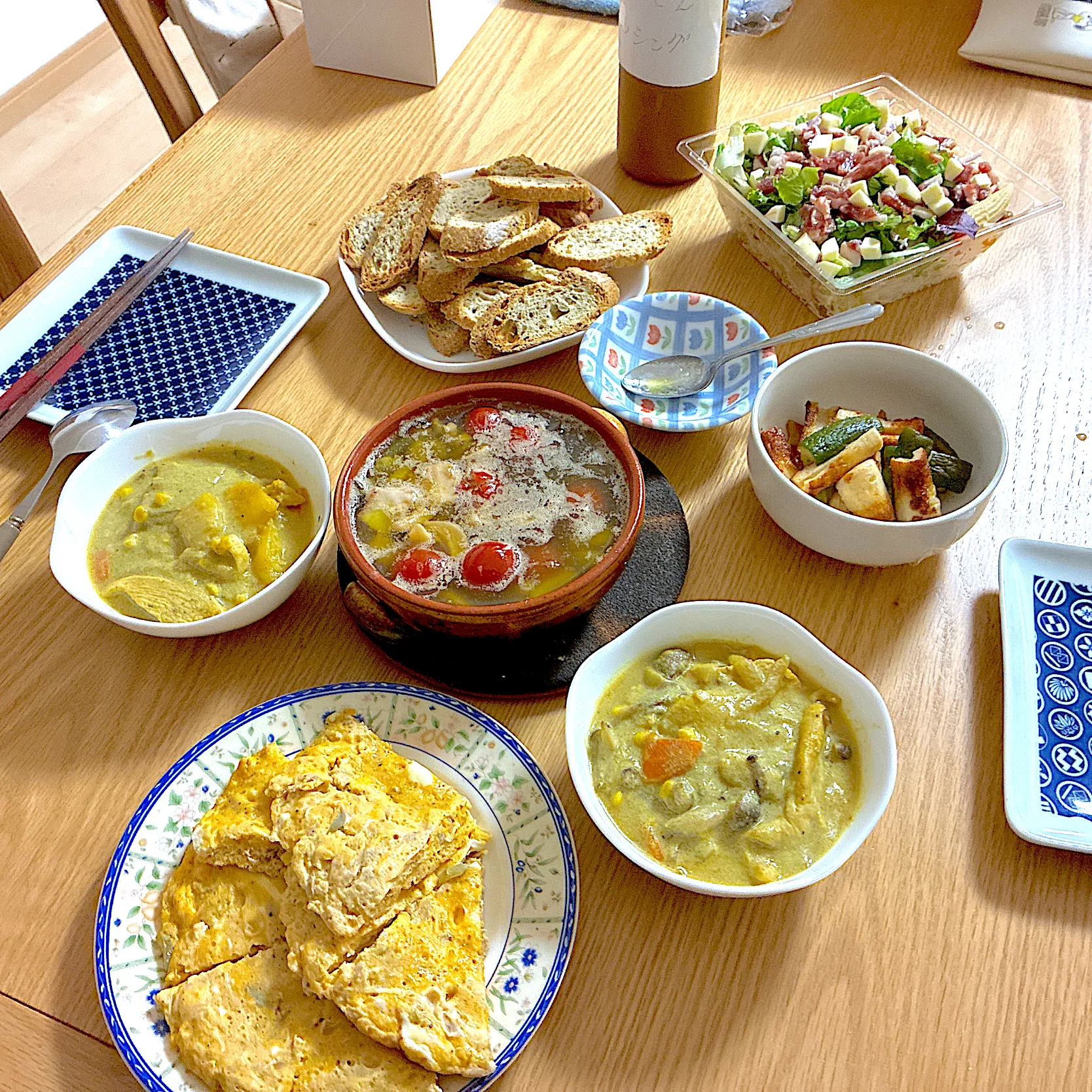 シーフードミックスとミニトマトのアヒージョ、雑穀バケット、ツナのオープンオムレツ、生ハムとチーズのサラダ、ちくわときゅうりのXO醬炒め、鶏むね肉と根菜の豆乳カレー、NYスタイルにんじんドレッシング。