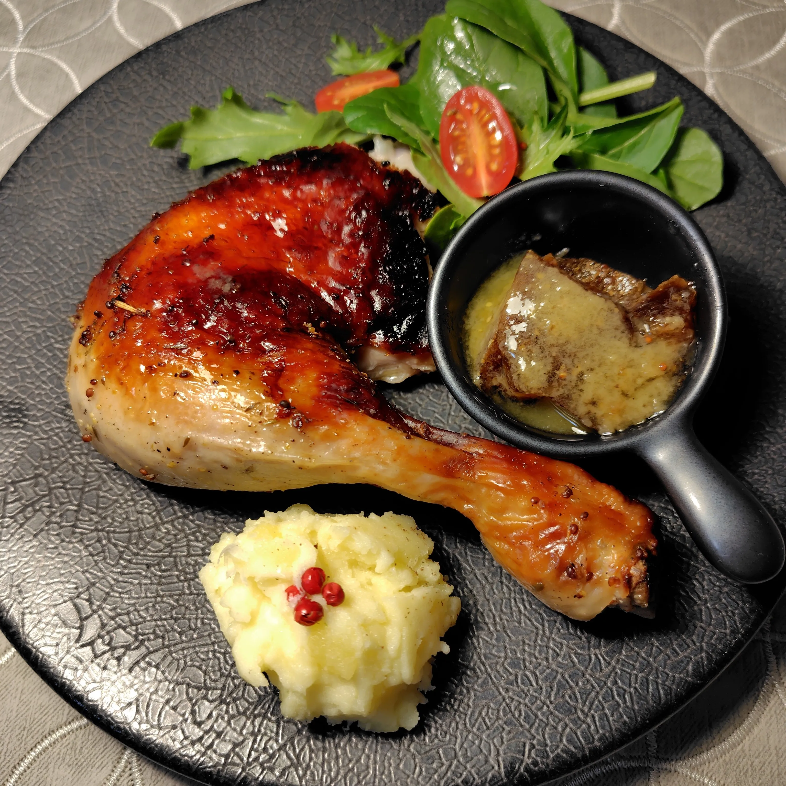 鶏肉に塩コショウ、ハーブ、粒マスタード、ハチミツ、オリーブオイルをかけて焼きました