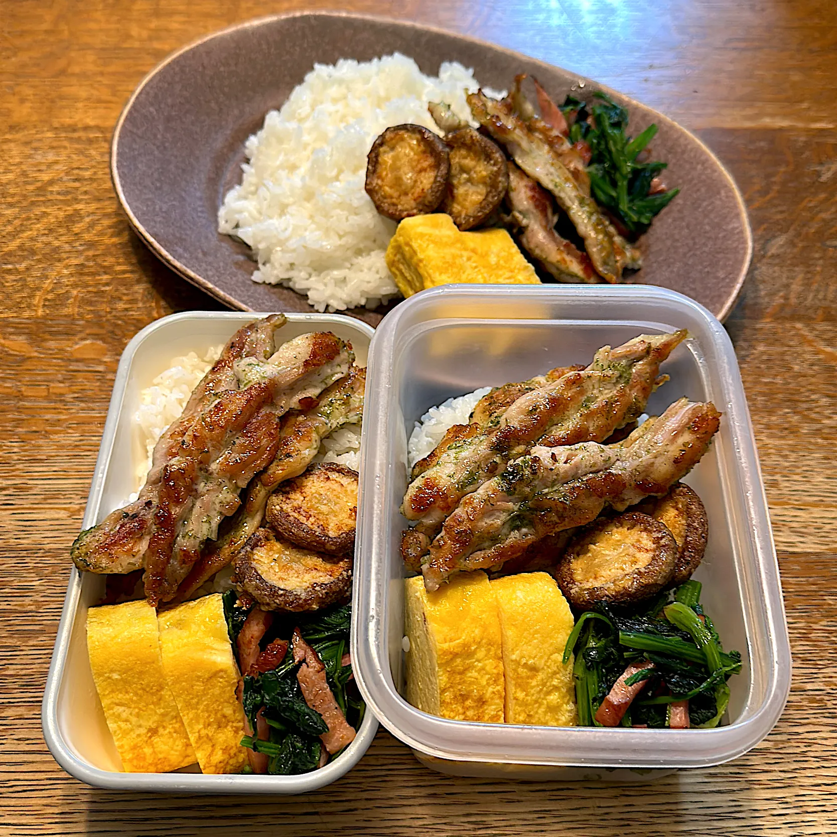 セセリの青のり風味焼き、椎茸のマヨチーズ焼き、ほうれん草とベーコンの炒め物、卵焼き