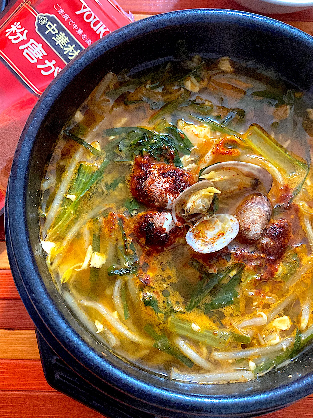 冷凍庫のアサリを使って、ユウキ食品さんの唐辛子🌶️を使って作りました😊
