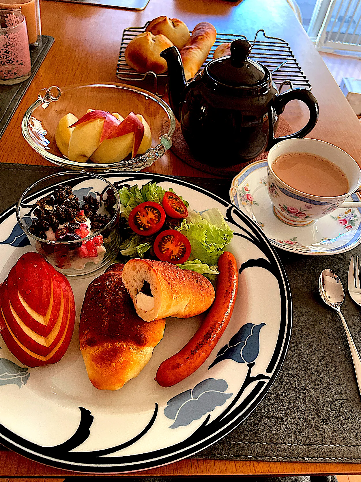 #モーニングプレート#昨夜焼いた塩パンと干し柿とクリームチーズのパン#アンクーンブラ茶園のキャンディーでミルクティー