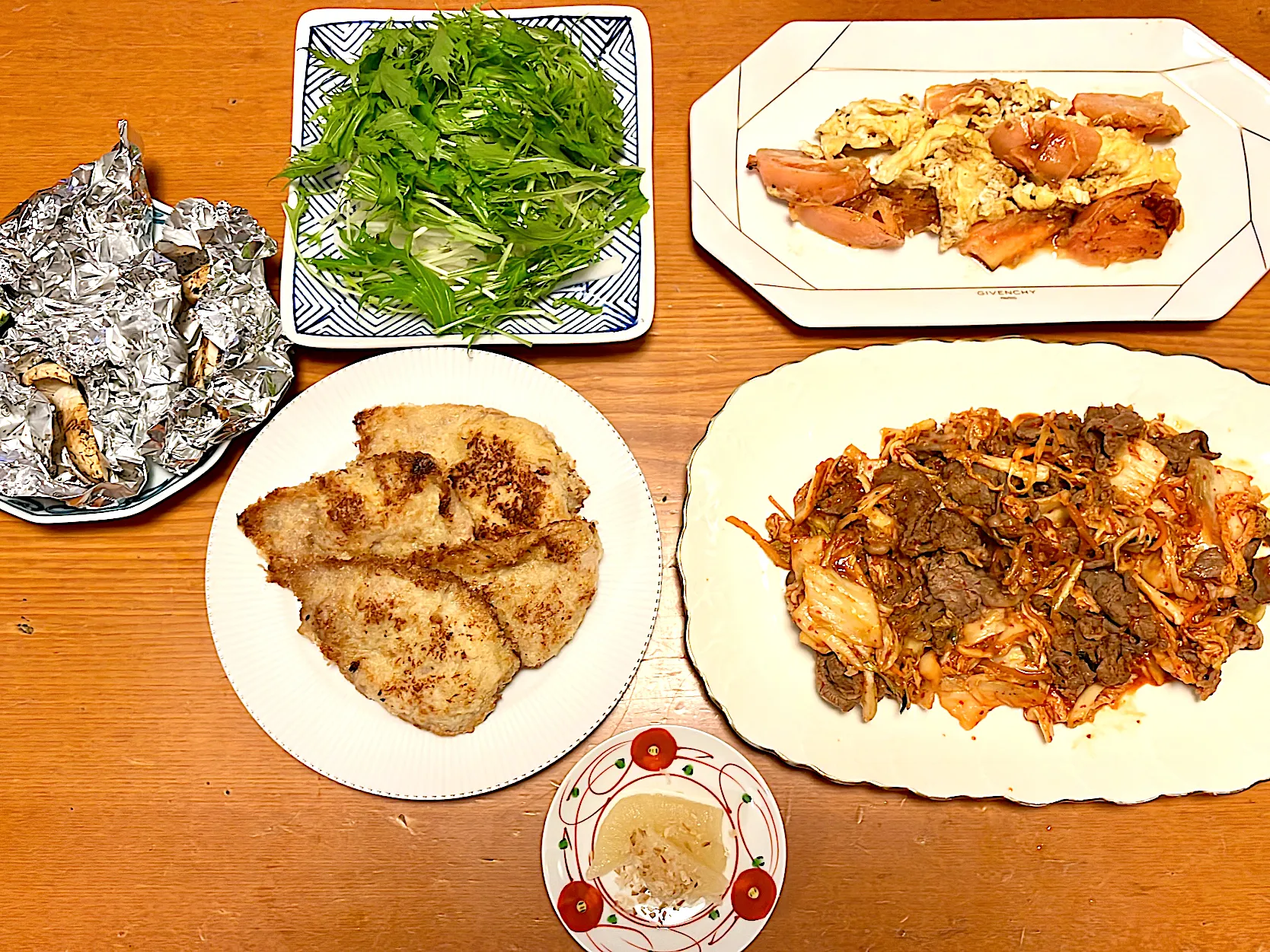 今夜は #白米 #松茸ホイル焼き #イギリス風カツ #キムチ炒め #トマ玉に炒め #水菜と大根のサラダ #数の子