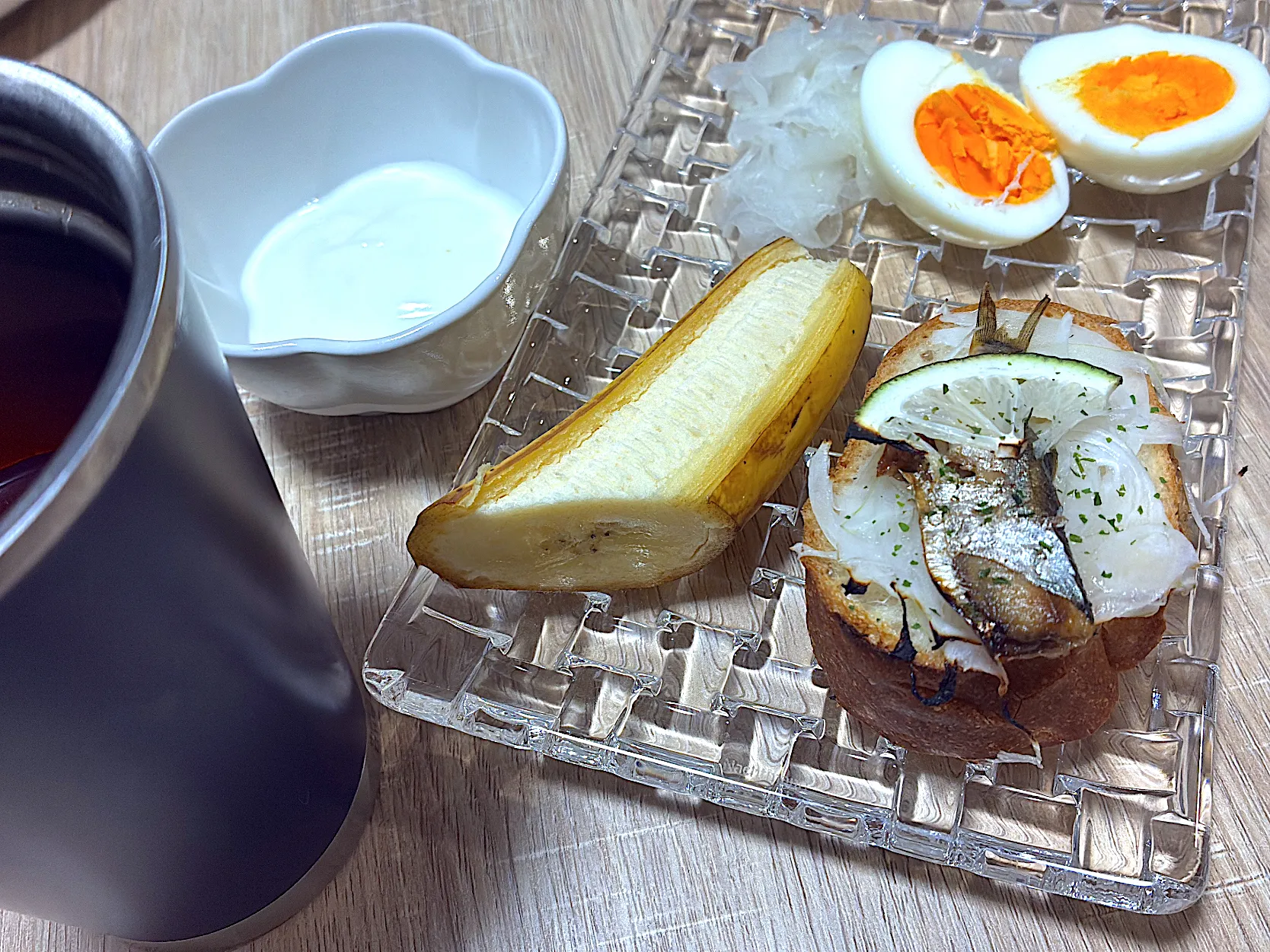 オイルサーディンのオープンサンド、ゆで卵、玉ねぎスライス、バナナ1/2本、無糖ヨーグルト大さじ2〜3くらい、ルイボスティ