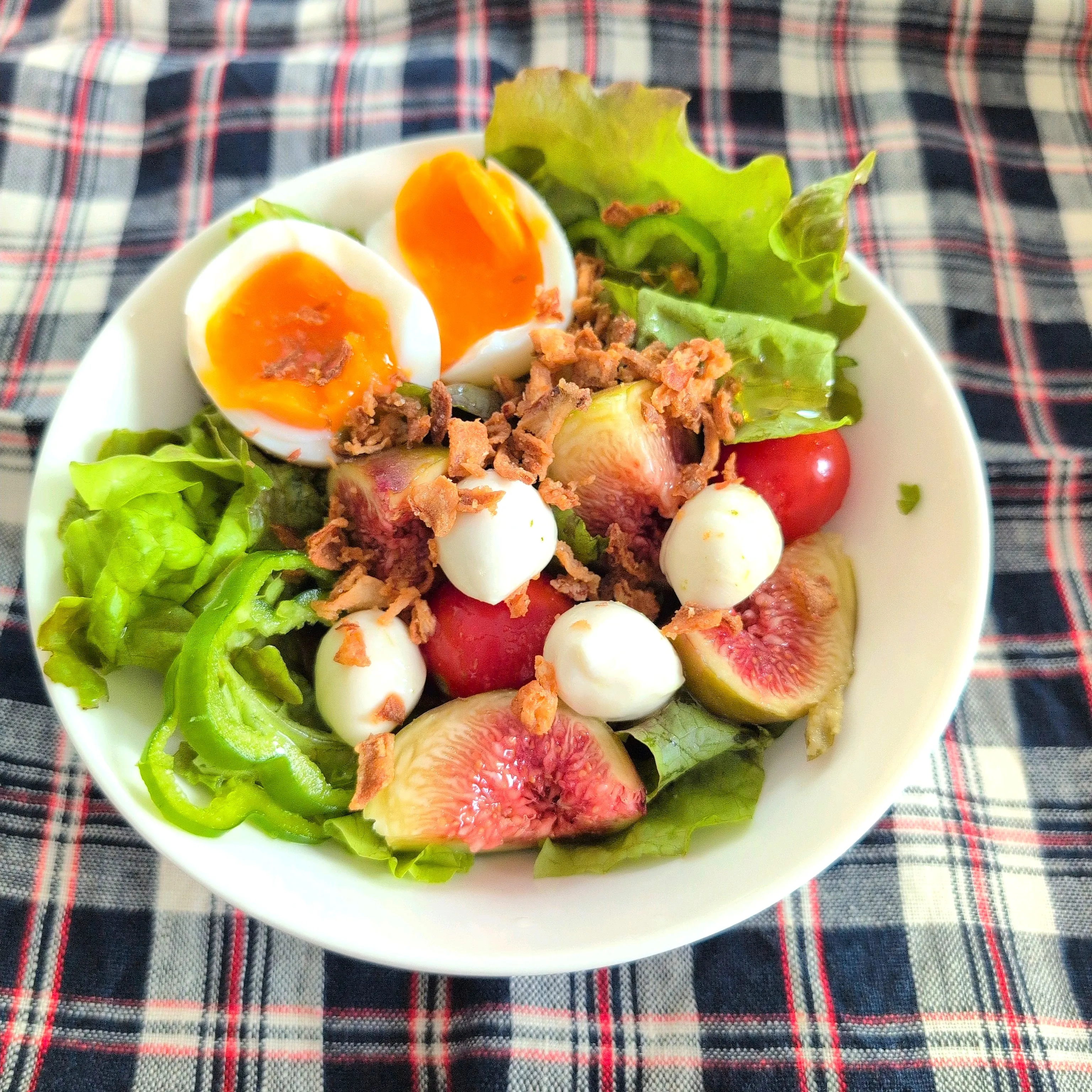 いちじく、半熟たまご、バジル入りモッツァレラチーズ、ミニトマト、ピーマン、レタス、フライドオニオン