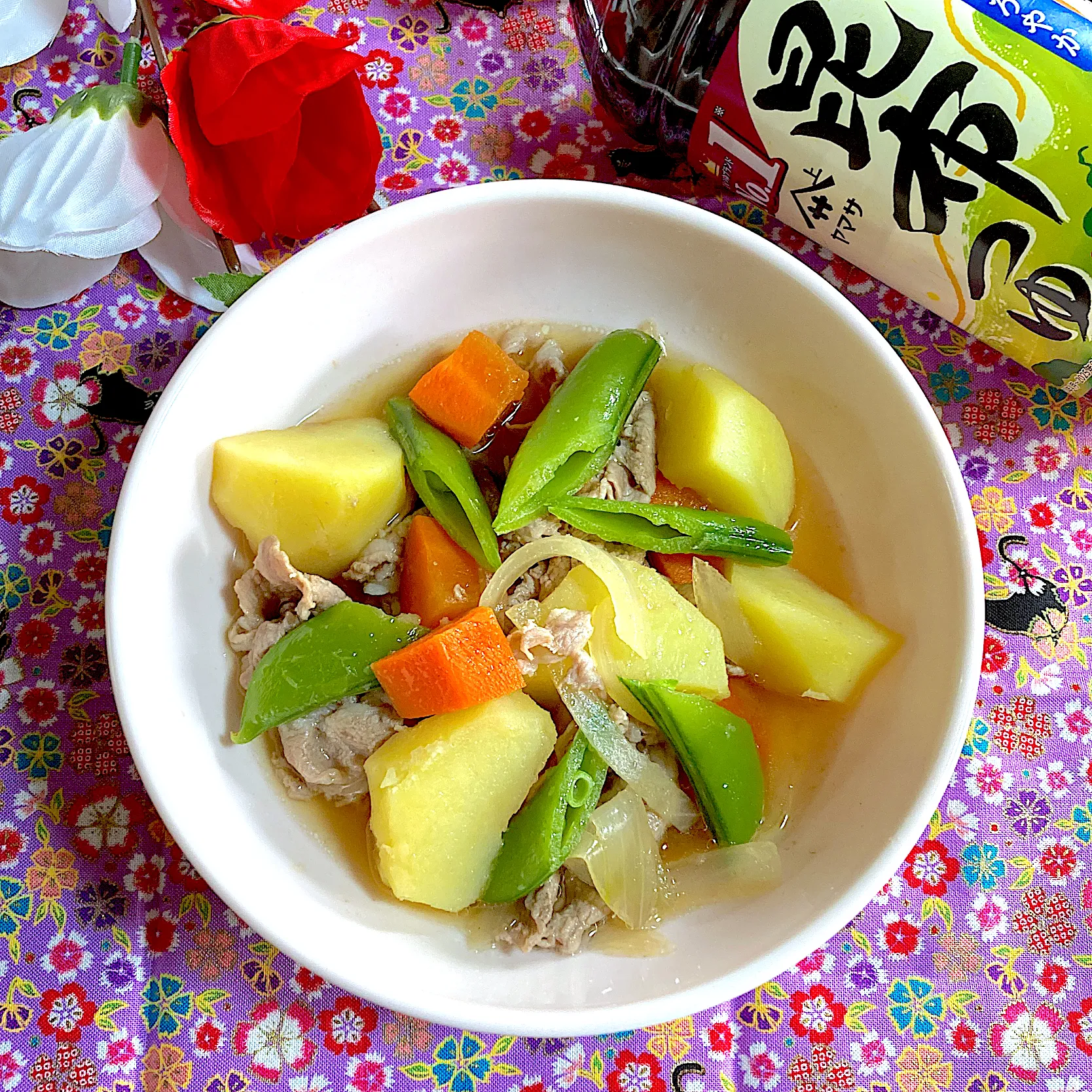 新じゃがにスナップエンドウの春野菜と豚肉で甘辛煮風にしました😄