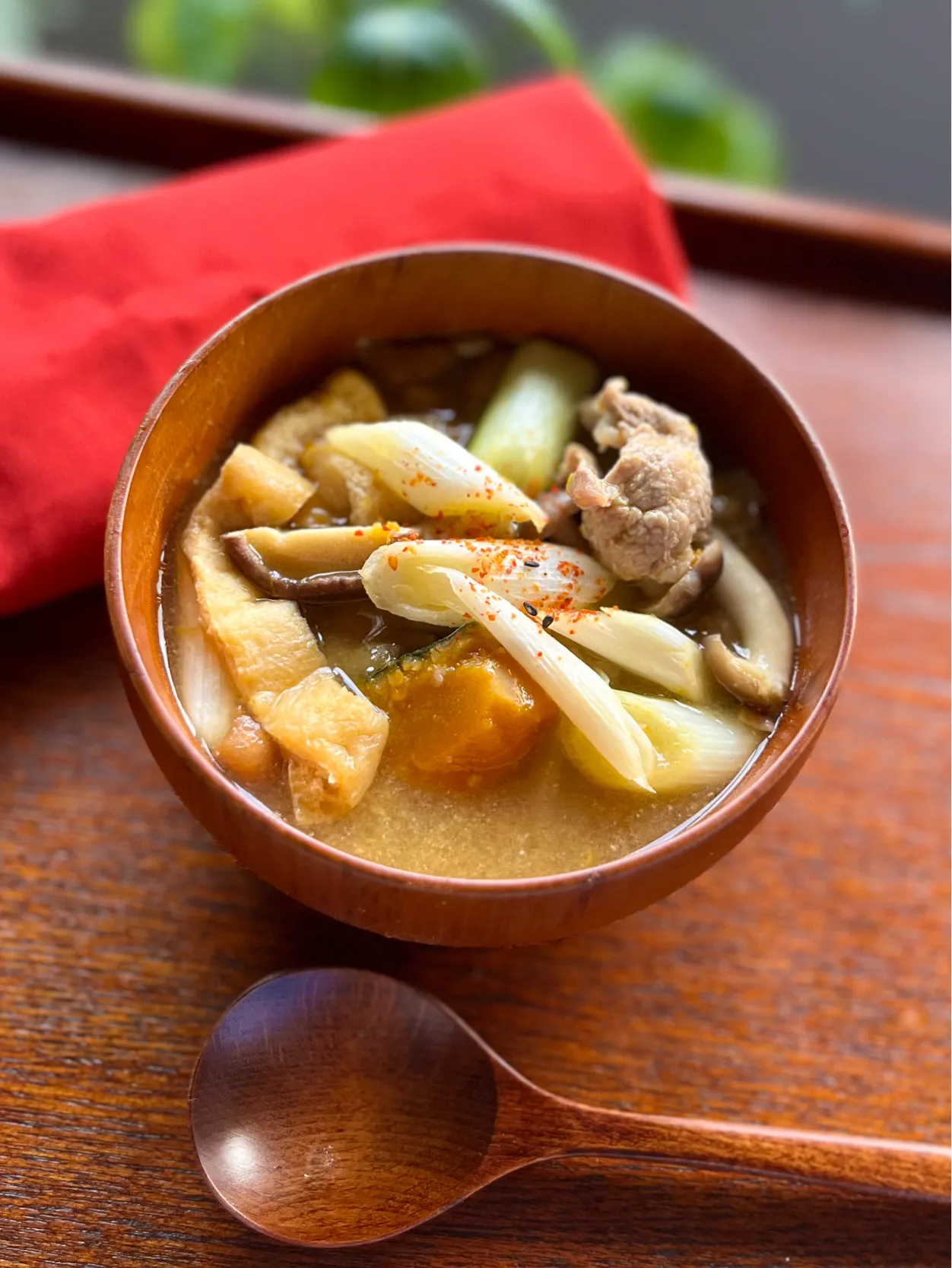 かぼちゃ、しいたけ、なめこ、しめじ、油揚げ、豚肉、大根、ねぎ… 秋の味覚をゴロゴロ入れて、食べごたえもバッチリ!