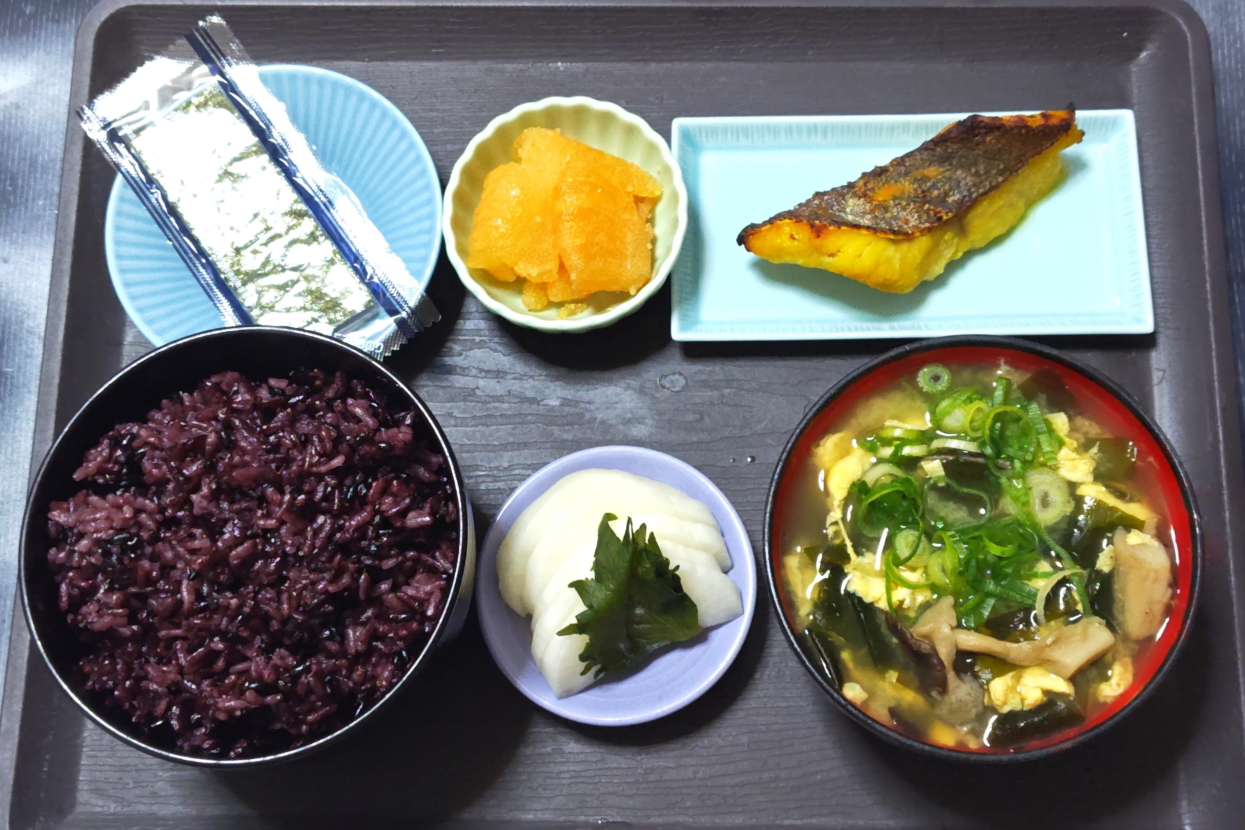 #朝食 #家飯 #自炊 #黒米 #黒紫米 #真鱈の西京焼 #真鱈の西京漬 #数の子 #味付けのり #平茸とわかめと卵のみそ汁 #しそ大根漬 #おうちごはん #和朝食 #焼魚朝食 #一汁二菜